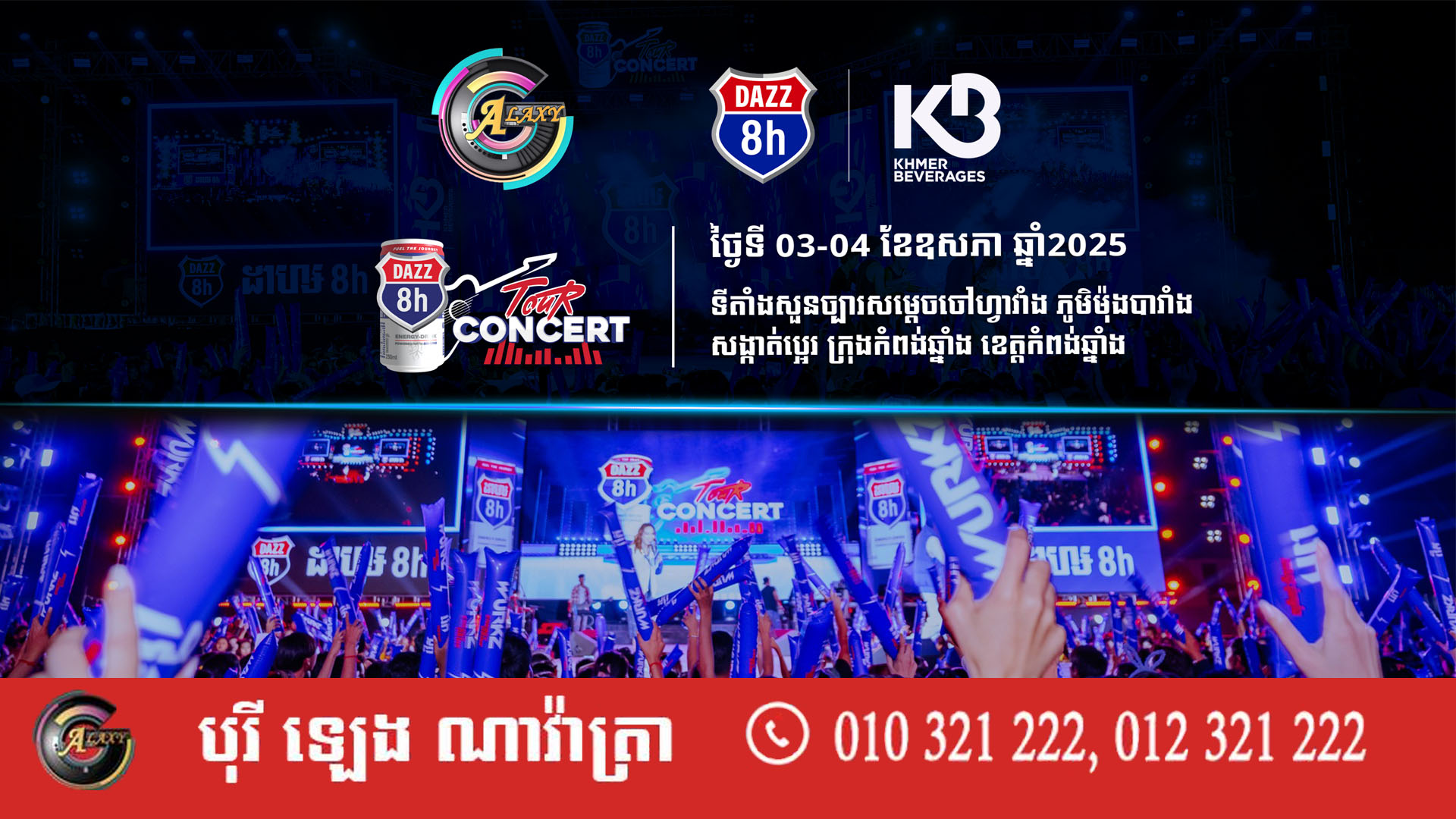 មហាព្រឹត្តិការណ៍ប្រគំតន្រ្តីប្រចាំប្រទេស Dazz Tour Concert របស់ក្រុមហ៊ុនខ្មែរ ប៊ែវើរីជីស សហការជាមួយផលិតកម្ម Galaxy Navatra សប្តាហ៍នេះមានកំពូលតារាចម្រៀង លោក ព្រាប សុវត្ថិ ,លោក ខេម ,កញ្ញា តន់ ចន្ទសីម៉ា ,លោក ខាន់ ជេមស៌ រួមជាមួយលោក Tempo Tris ,លោក សុវត្ថិ មុនីវណ្ណ ,លោក សុវត្ថិ សិរីវុឌ្ឍ ,លោក Nak Fake ,កញ្ញា អេមមី , កញ្ញា NANA , លោក Vin Trapz និងលោក រ៉ុន គឹមសន ព្រមទាំងកំពូលតារាចម្រៀង ឧកញ៉ា ខេមរៈ សិរីមន្ត ក៏អញ្ជើញចូលរួមផងដែរ ដែលនឹងមកអង្រួញឆាកតន្រ្តី DAZZ Tour Concert ឱ្យកក្រើករញ្ជួយដីតែម្តង ។