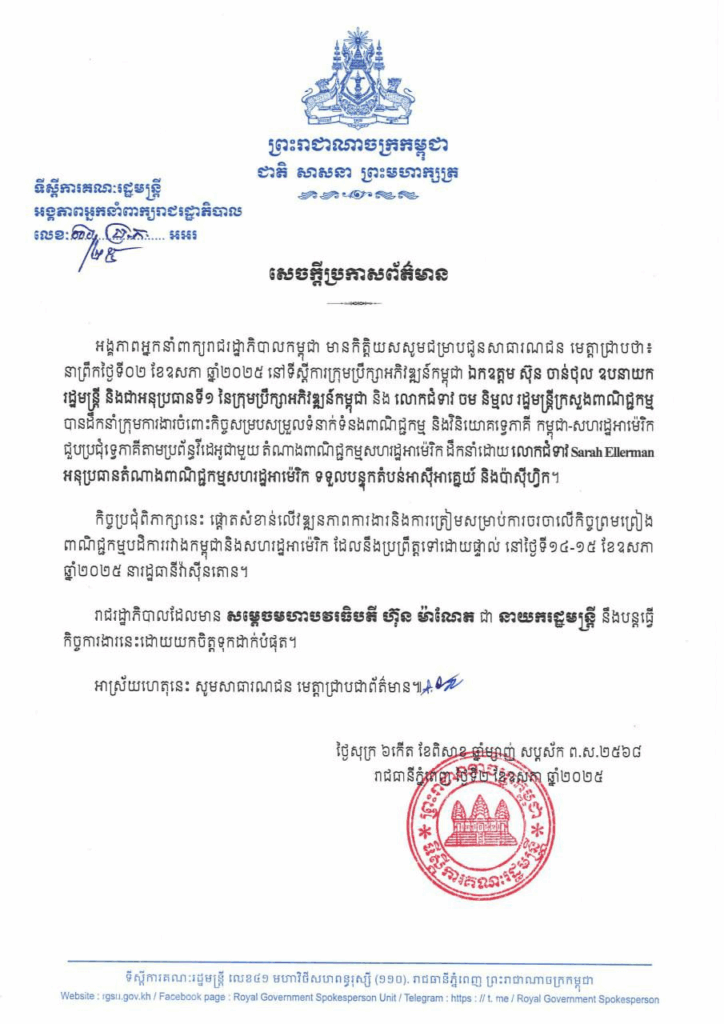 អង្គភាពអ្នកនាំពាក្យរាជរដ្ឋាភិបាល បានឱ្យដឹងថារដ្ឋាភិបាលកម្ពុជា និងអាមេរិក កំពុងត្រៀមសម្រាប់ការចរចាលើកិច្ចព្រមព្រៀងពាណិជ្ជកម្មបដិការរវាងកម្ពុជានិងសហរដ្ឋអាម៉េរិក ដែលនឹងប្រព្រឹត្តទៅដោយផ្ទាល់នៅថ្ងៃទី១៤-១៥ ខែឧសភា ឆ្នាំ២០២៥ ខាងមុខនេះ នារដ្ឋធានីវ៉ាស៊ីនតោន។