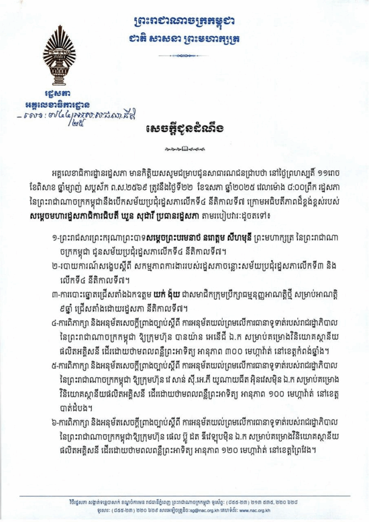 ក្នុងចំណោមរបៀបវារៈ២៨ ដែលសម័យប្រជុំរដ្ឋសភា ត្រូវពិភាក្សាអនុម័តនោះ មានរបៀបវារៈ ចំនួន២៤ តាមការស្នើរបស់រាជរដ្ឋាភិបាល គឺសេចក្តីព្រាងច្បាប់ស្តីពីការអនុម័តយល់ព្រមលើការធានាទូទាត់របស់រាជរដ្ឋាភិបាលកម្ពុជា ឱ្យកុមហ៊ុនវិនិយោគផលិតថាមពលអគ្គិសនីដើរដោយថាមពលពន្លឺព្រះអាទិត្យ និងថាមពលអគ្គិសនីដើរដោយខ្យល់។