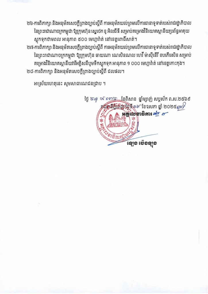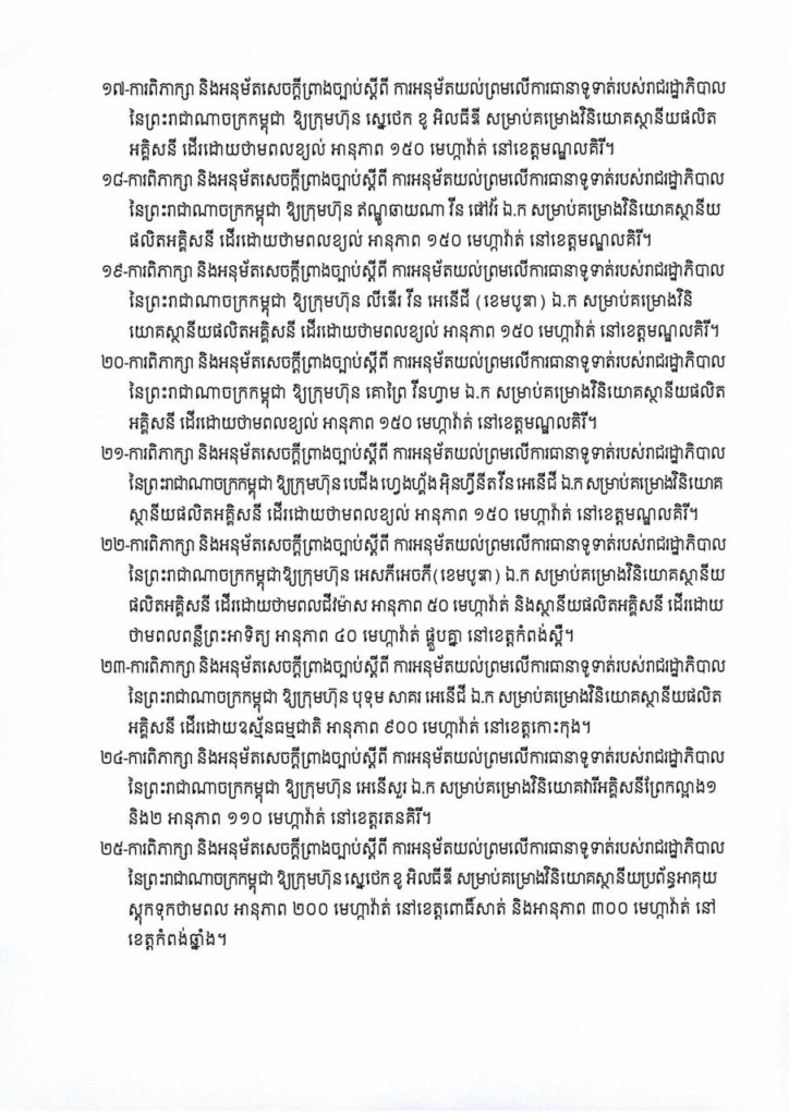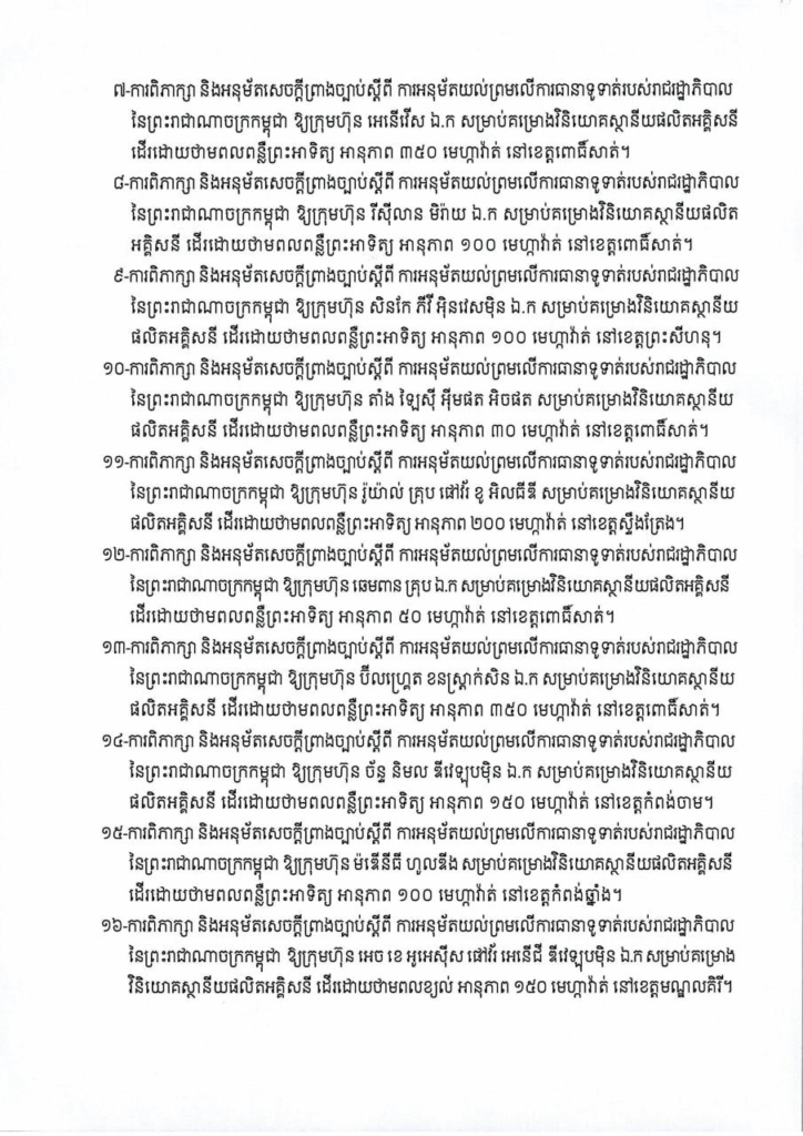 សូមបញ្ជាក់ថា ក្រុមហ៊ុនវិនិយោគទាំង២៤ ដែលត្រូវបានអនុម័តរួមមានខេត្តកំពង់ឆ្នាំង៣គម្រោង វិនិយោគលើថាមពលពន្លឺព្រះអាទិត្យ គម្រោង​វិនិយោគ​ស្ថានីយ​ប្រព័ន្ធ​អា​គុយ​ស្ដុក​ទុក ថាមពល, ខេត្តបាត់ដំបង ១គម្រោង  ​ផលិត​អគ្គិសនី ដើរ​ដោយ​ថាមពល​ពន្លឺព្រះអាទិត្យ, ខេត្តព្រៃវែង១គម្រោង ផលិត​អគ្គិសនី ដើរ​ដោយ​ថាមពល​ពន្លឺព្រះអាទិត្យ, ខេត្តពោធិ៍សាត់៦គម្រោង ​ផលិត​អគ្គិសនី ដើរ​ដោយ​ថាមពល​ពន្លឺព្រះអាទិត្យ និងគម្រោង​វិនិយោគ​ស្ថានីយ​ប្រព័ន្ធ​អា​គុយ​ស្ដុក​ទុក ថាមពល។