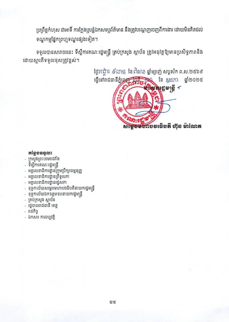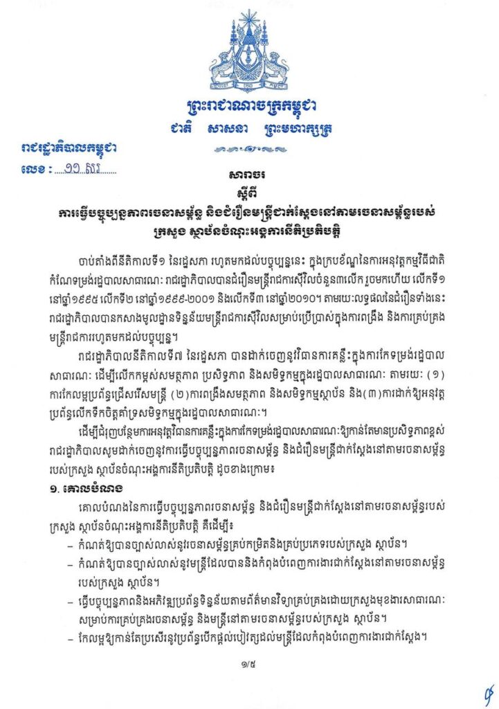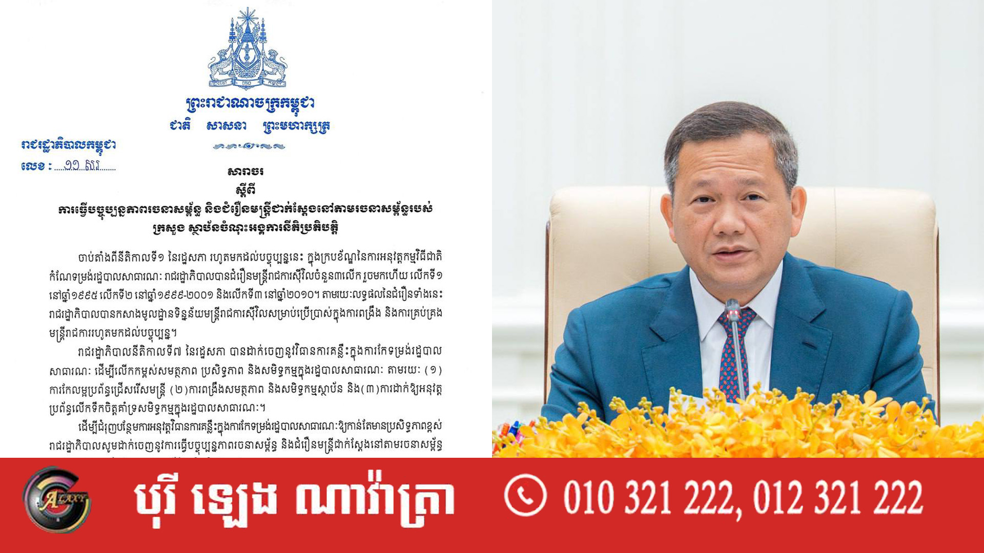 សម្តេចមហាបវរធិបតី ហ៊ុន ម៉ាណែត នាយករដ្ឋមន្ត្រីកម្ពុជា នៅថ្ងៃទី២០ ខែឧសភា ឆ្នាំ២០២៥ បានចេញសារាចរស្តីពីការធ្វើបច្ចុប្បន្នភាពរចនាសម្ព័ន្ធ និងជំរឿនមន្ត្រីជាក់ស្តែងនៅតាមរចនាសម្ព័ន្ធរបស់ក្រសួង ស្ថាប័នចំណុះអង្គការនីតិប្រតិបត្តិ។