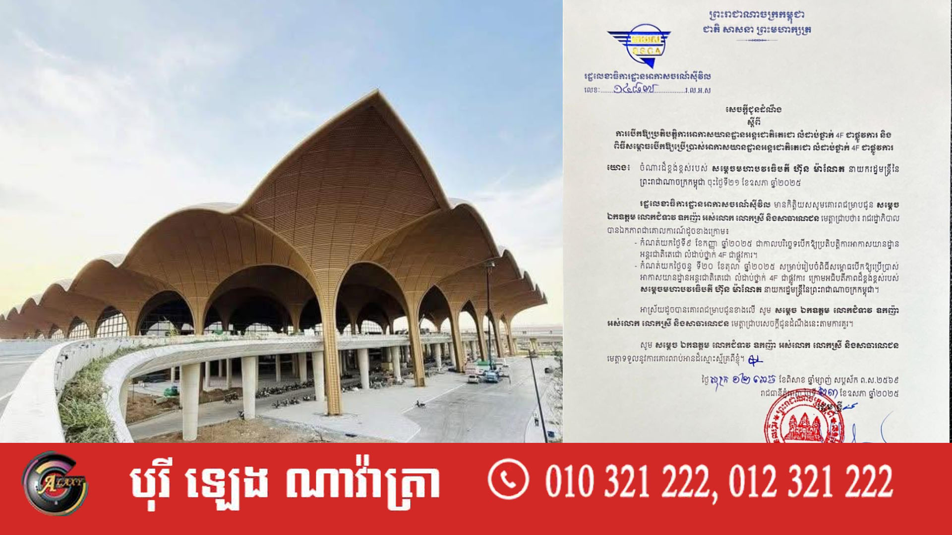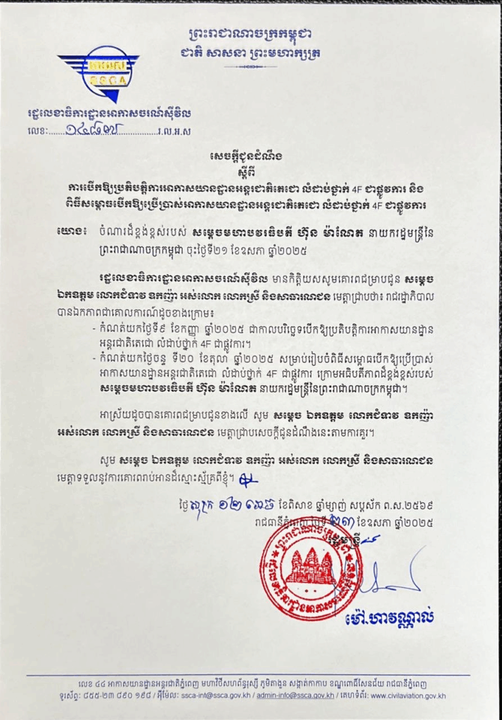 កំណត់យកថ្ងៃទី៩ ខែកញ្ញា ឆ្នាំ២០២៥ ជាកាលបរិច្ឆេទបើកឱ្យប្រតិបត្តិការអាកាសយានដ្ឋាន អន្តរជាតិតេជោ លំដាប់ថ្នាក់ 4F ជាផ្លូវការ។