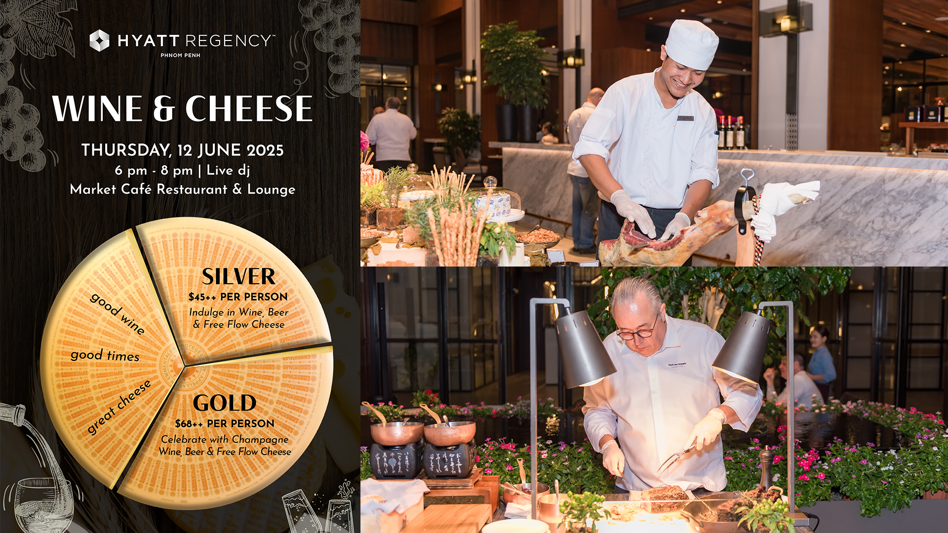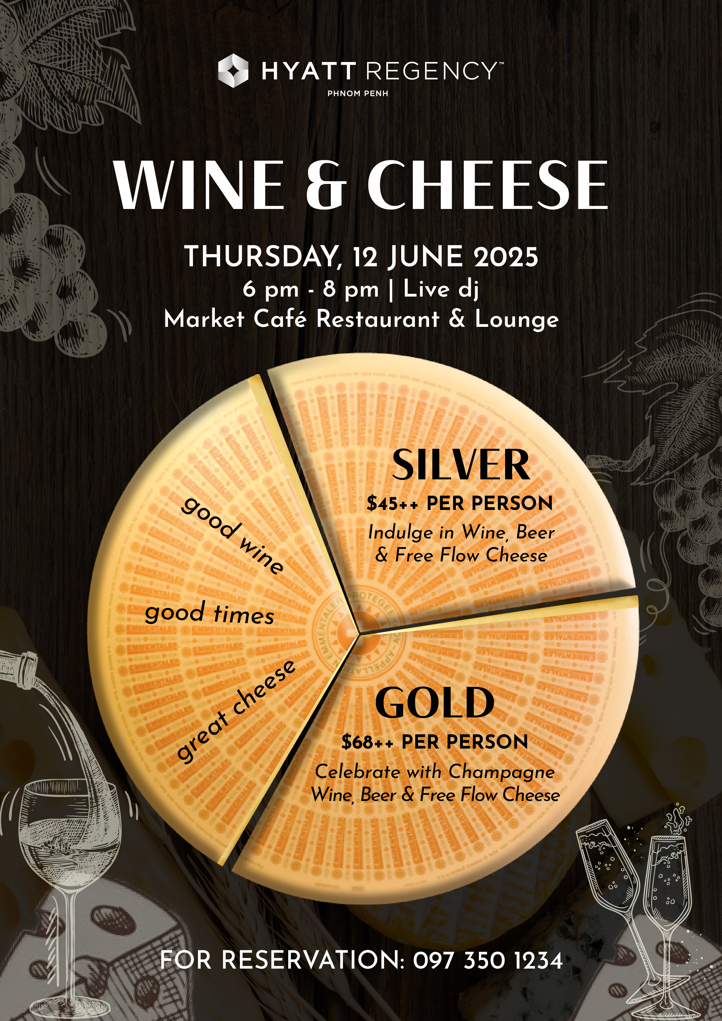 សណ្ឋាគារ ហៃយ៉ាត់ រីជិនស៊ី ភ្នំពេញ បានរៀបចំព្រឹត្តិការណ៍ដ៏អស្ចារ្យ ឈីសលំដាប់អន្តរជាតិ ដែលផ្គូផ្គងជាមួយនិង ស្រាសាំប៉ាញ ស្រាក្រហម ស្រាសរ និងស្រាបៀរ ព្រឹត្តិការណ៍នេះមានតែ ១ថ្ងៃប៉ុណ្ណោះក្នុង១ខែ ដែលនឹងប្រព្រឹត្តទៅនៅ ថ្ងៃទី១២ ខែមិថុនា ឆ្នាំ២០២៥។