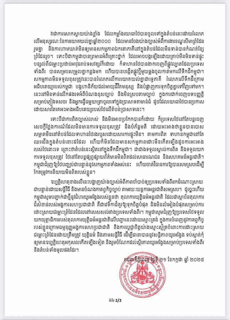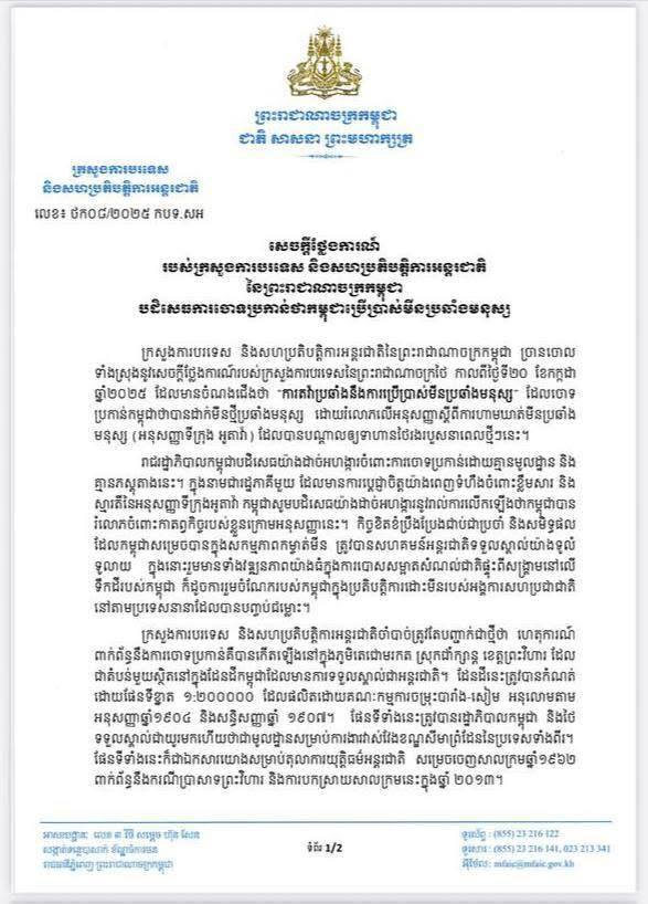 ក្រសួងការបរទេស និងសហប្រតិបត្តិការអន្តរជាតិនៃព្រះរាជាណាចក្រកម្ពុជា នៅថ្ងៃទី២១ ខែកក្កដា ឆ្នាំ២០២៥ បានចេញសេចក្តីថ្លែងការណ៍ បដិសេធការចោទប្រកាន់របស់ថៃ ដែលថាកម្ពុជាប្រើប្រាស់មីនប្រឆាំងមនុស្ស។