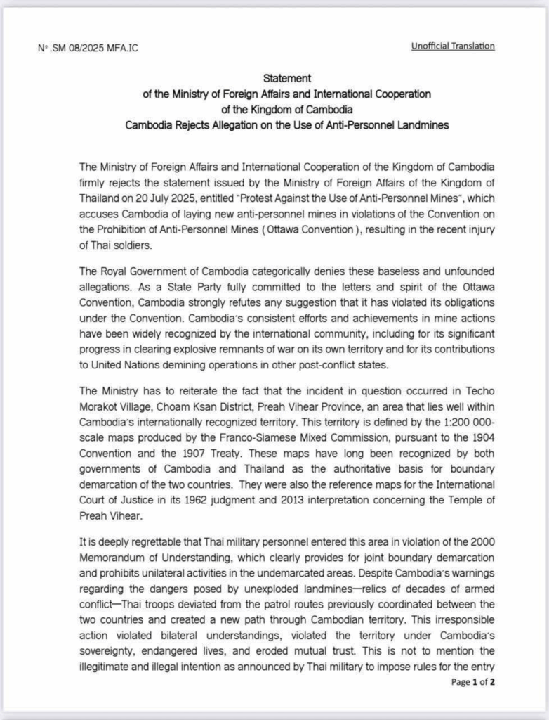 ក្រសួងការបរទេស និងសហប្រតិបត្តិការអន្តរជាតិនៃព្រះរាជាណាចក្រកម្ពុជា ច្រានចោលទាំងស្រុងនូវសេចក្តីថ្លែងការណ៍របស់ក្រសួងការបរទេសនៃព្រះរាជាណាចក្រថៃ កាលពីថ្ងៃទី២០ ខែកក្កដា ឆ្នាំ២០២៥ ដែលមានចំណងជើងថា «ការតវ៉ាប្រឆាំងនឹងការប្រើប្រាស់មីនប្រឆាំងមនុស្ស» ដែលចោទប្រកាន់កម្ពុជាថា បានដាក់មីនថ្មីប្រឆាំងមនុស្ស ដោយរំលោភលើអនុសញ្ញាស្ដីពីការហាមឃាត់មីនប្រឆាំង