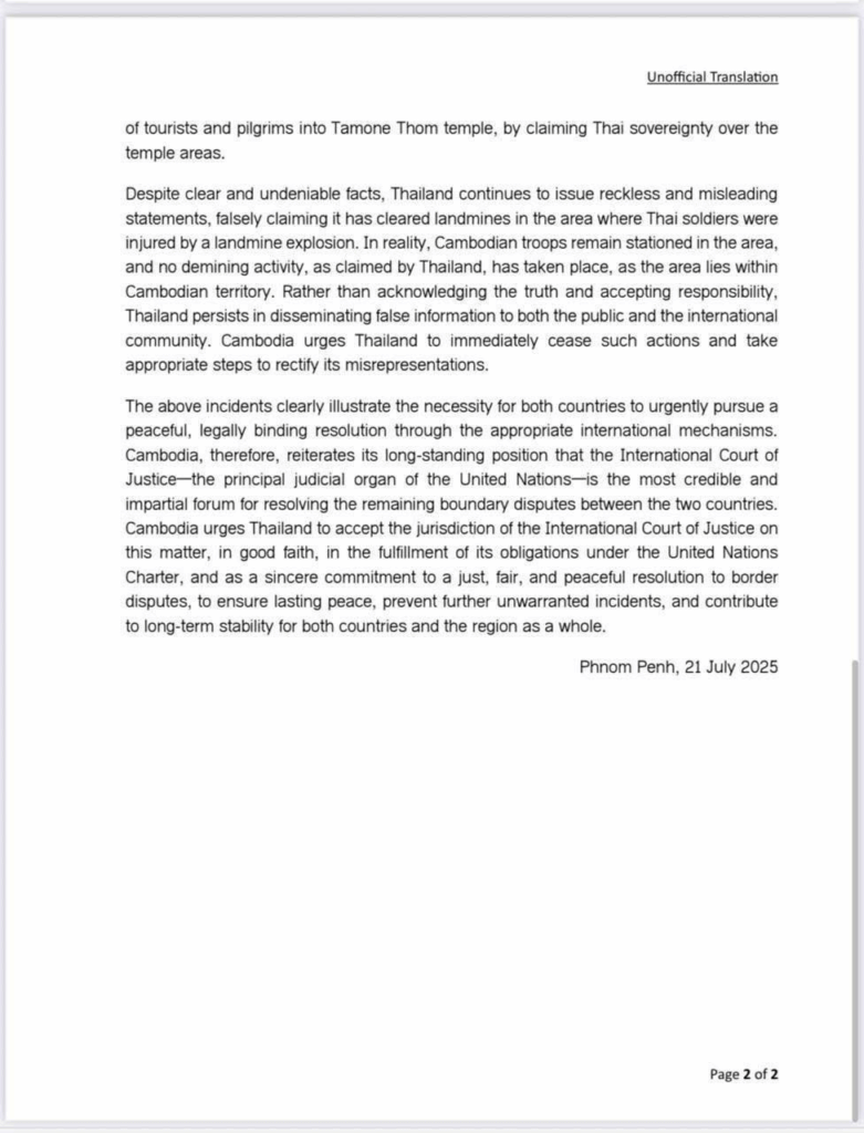 ឧប្បត្តិហេតុខាងលើនេះបង្ហាញយ៉ាងច្បាស់អំពីភាពចាំបាច់ឲ្យប្រទេសទាំងពីររកដំណោះស្រាយជាបន្ទាន់ដោយសន្តិវិធី និងមានចំណងកាតព្វកិច្ចច្បាប់ តាមរយៈយន្តការអន្តរជាតិសមស្រប។ ដូច្នេះហើយកម្ពុជាសូមបញ្ជាក់ជាថ្មីនូវជំហរយូរអង្វែងរបស់ខ្លួនថា តុលាការយុត្តិធម៌អន្តរជាតិ ដែលជាស្ថាប័នតុលាការដ៏សំខាន់របស់អង្គការសហប្រជាជាតិ គឺជាវេទិកាដ៏គួរឱ្យទុកចិត្តបំផុត និងមិនលំអៀងបំផុតសម្រាប់ការដោះស្រាយជម្លោះព្រំដែនដែលនៅសេសសល់រវាងប្រទេសទាំងពីរ។