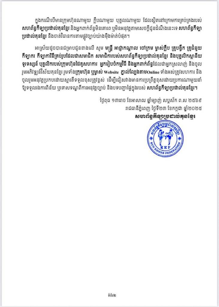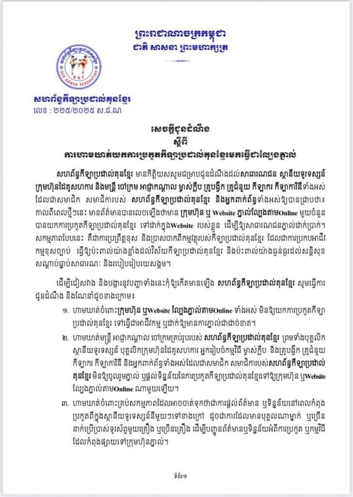 សហព័ន្ធកីឡាប្រដាល់គុនខ្មែរ នៅថ្ងៃទី២៣ ខែកក្កដា ឆ្នាំ២០២៥នេះ បានចេញសេចក្ដីជូនដំណឹងស្តីពី ការហាមឃាត់យកការប្រកួតកីឡាប្រដាល់គុនខ្មែរមកធ្វើជាល្បែងភ្នាល់ ក្រោយពីលេចចេញព័ត៌មានថាមាន ក្រុមហ៊ុន ឬ Website ភ្នាល់ល្បែងតាមOnline មួយចំនួន បានយកការប្រកួតកីឡាប្រដាល់គុនខ្មែរ ទៅដាក់ក្នុងWebsite របស់ខ្លួន ដើម្បីឱ្យសាធារណជនភ្នាល់ដាក់ប្រាក់។