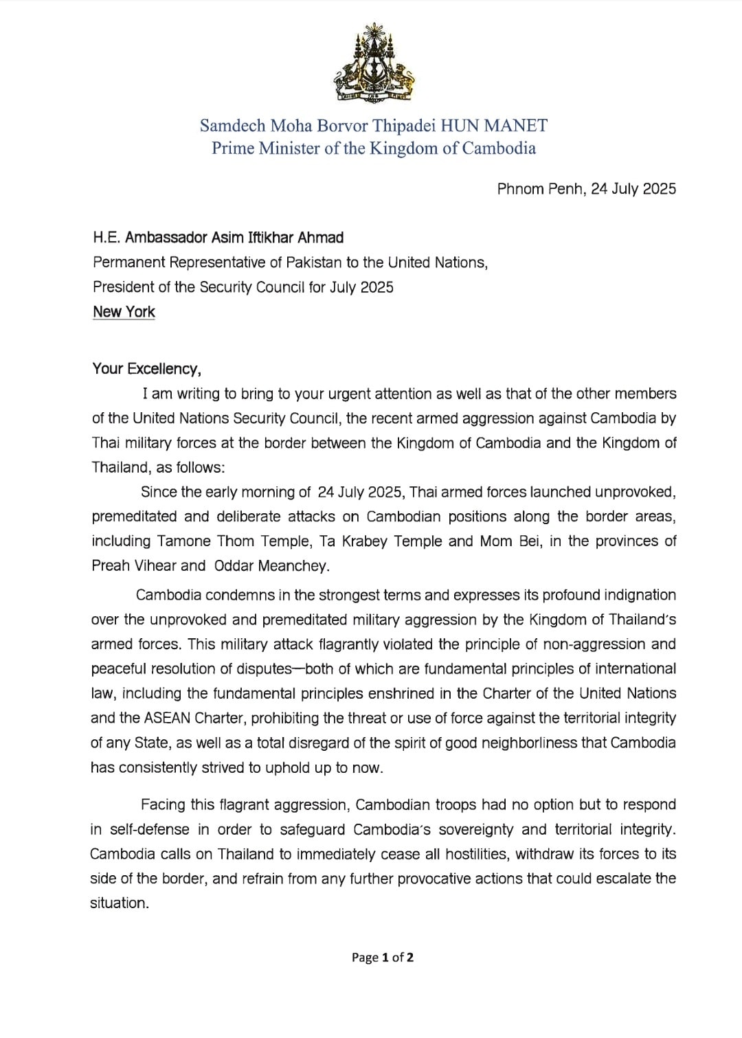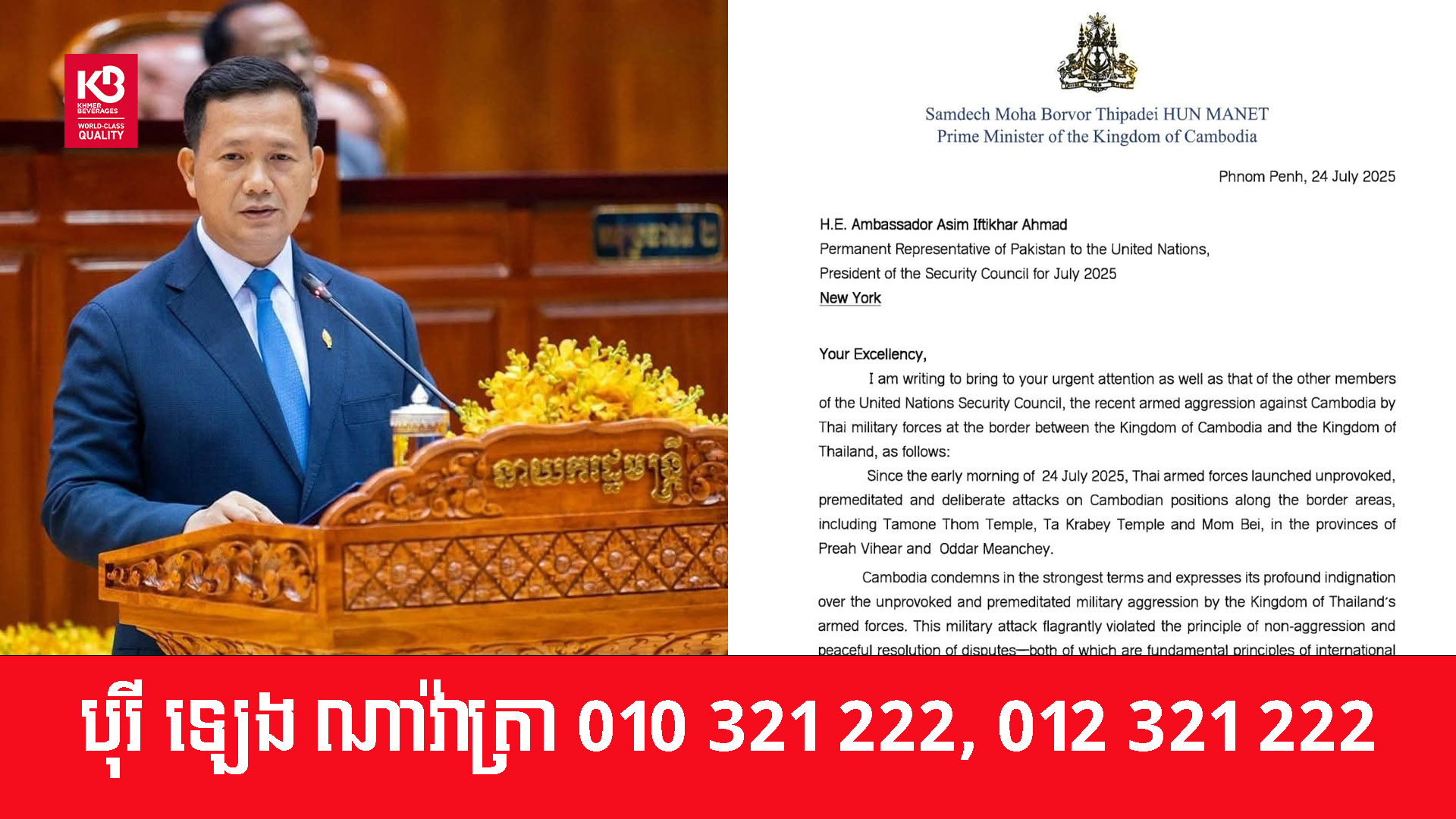 សម្តេចធិបតី ហ៊ុន ម៉ាណែត នាយករដ្ឋមន្ត្រីកម្ពុជា នាវេលាថ្ងៃត្រង់ ទី២៤ ខែកក្កដានេះ បានផ្ញើលិខិតជូនឯកឧត្តម Asim Iftikhar Ahmad ប្រធានប្តូរវេនក្រុមប្រឹក្សាសន្តិសុខអង្គការសហប្រជាជាតិ សម្រាប់ខែកក្កដា ឆ្នាំ២០២៥ ស្នើសុំកោះប្រជុំក្រុមប្រឹក្សាសន្តិសុខជាបន្ទាន់ ដើម្បីសុំការអន្តរាគមន៍បញ្ចប់ការឈ្លានពានរបស់កងទ័ពថៃមកលើដែនអធិបតេយ្យភាពរបស់កម្ពុជា។