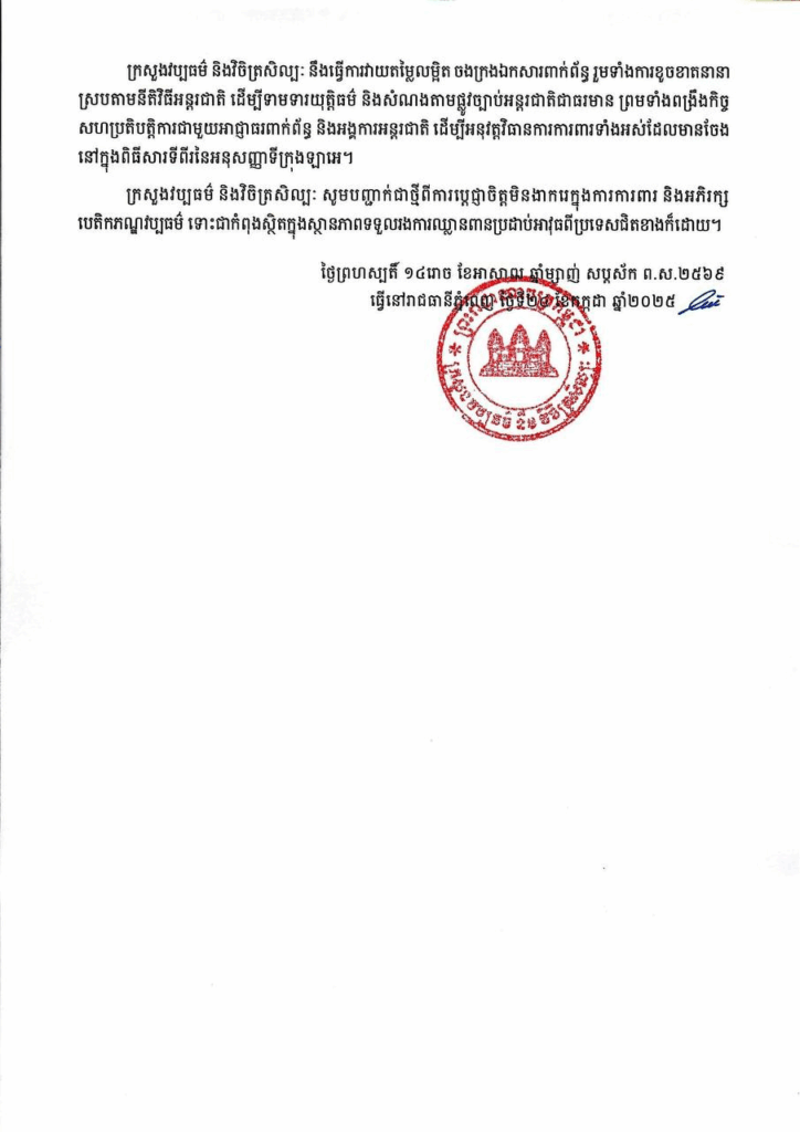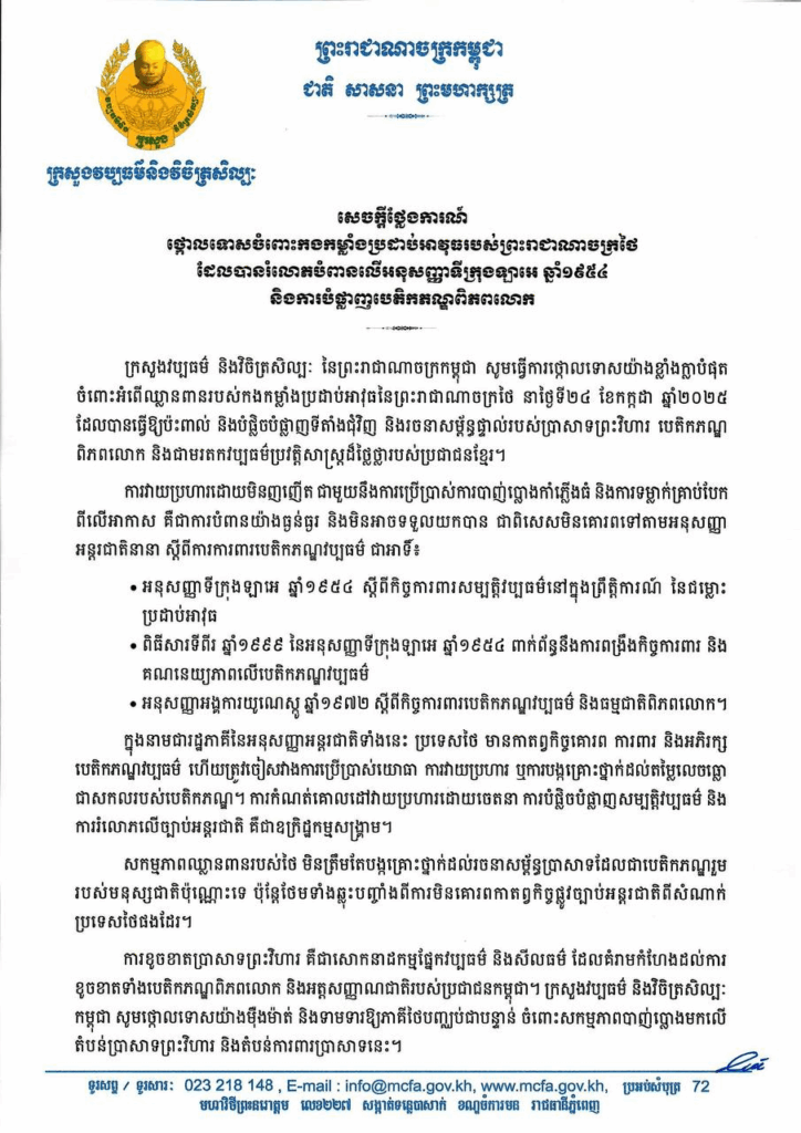 តាមរយៈសេចក្ដីថ្លែងការណ៍នេះ ក្រសួងវប្បធម៌បានធ្វើការថ្កោលទោសយ៉ាងខ្លាំងក្លាបំផុត ចំពោះអំពើឈ្លានពានរបស់កងកម្លាំងប្រដាប់អាវុធនៃព្រះរាជាណាចក្រថៃ នាថ្ងៃទី២៤ ខែកក្កដា ឆ្នាំ២០២៥ ដែលបានធ្វើឱ្យប៉ះពាល់ និងបំផ្លិចបំផ្លាញទីតាំងជុំវិញ និងរចនាសម្ព័ន្ធផ្ទាល់របស់ប្រាសាទព្រះវិហារ បេតិកភណ្ឌ ពិភពលោក និងជាមរតកវប្បធម៌ប្រវត្តិសាស្ត្រដ៏ថ្លៃថ្លារបស់ប្រជាជនខ្មែរ។