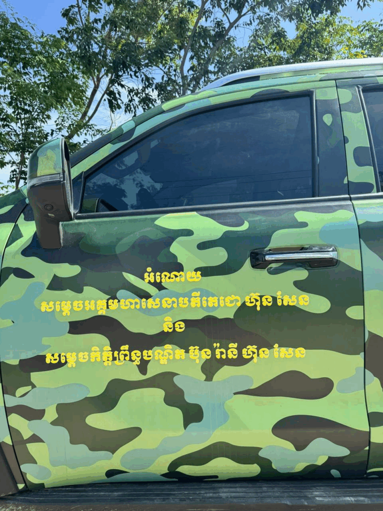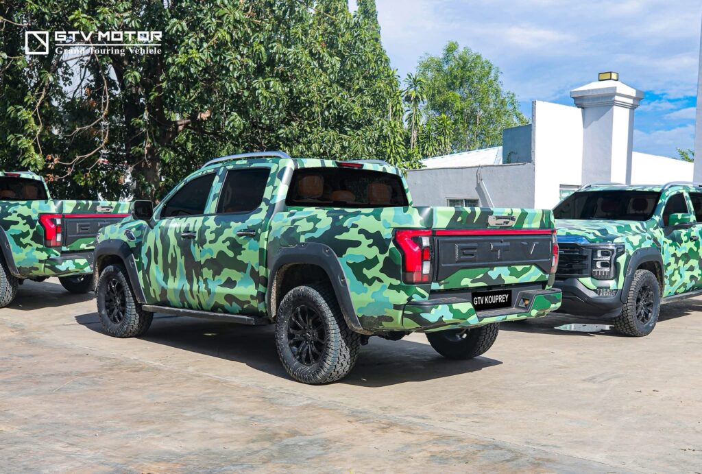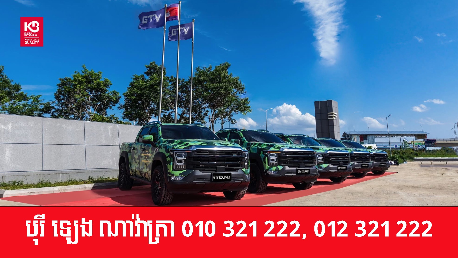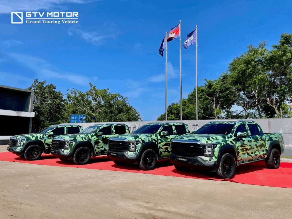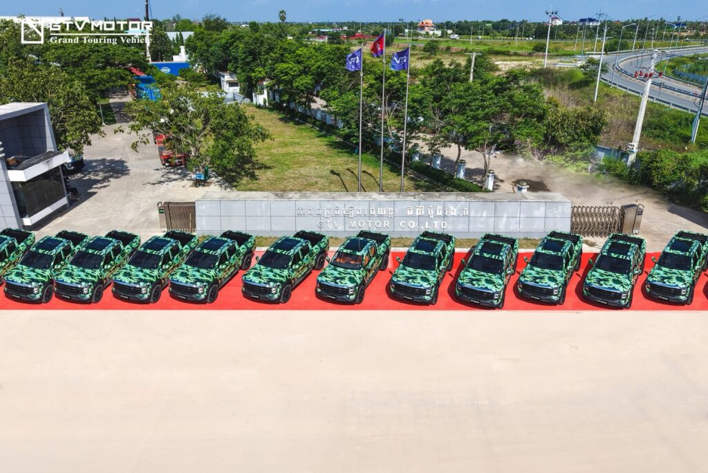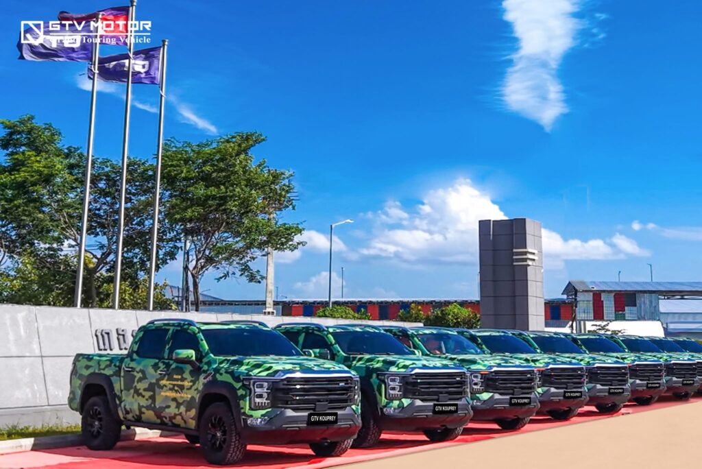 រថយន្ត Pick Up ក្រុមហ៊ុន GTV Motors Cambodia  ម៉ាក GTV គោព្រៃ ចំនួន ១២គ្រឿង បំពាក់សំបកកង់ខ្មែរម៉ាក សៃលុន បានត្រៀមខ្លួនរួចជាស្រេចសម្រាប់បម្រើការជូនកងទ័ពកម្ពុជាជួរមុខ នៅខេត្តព្រះវិហារ។