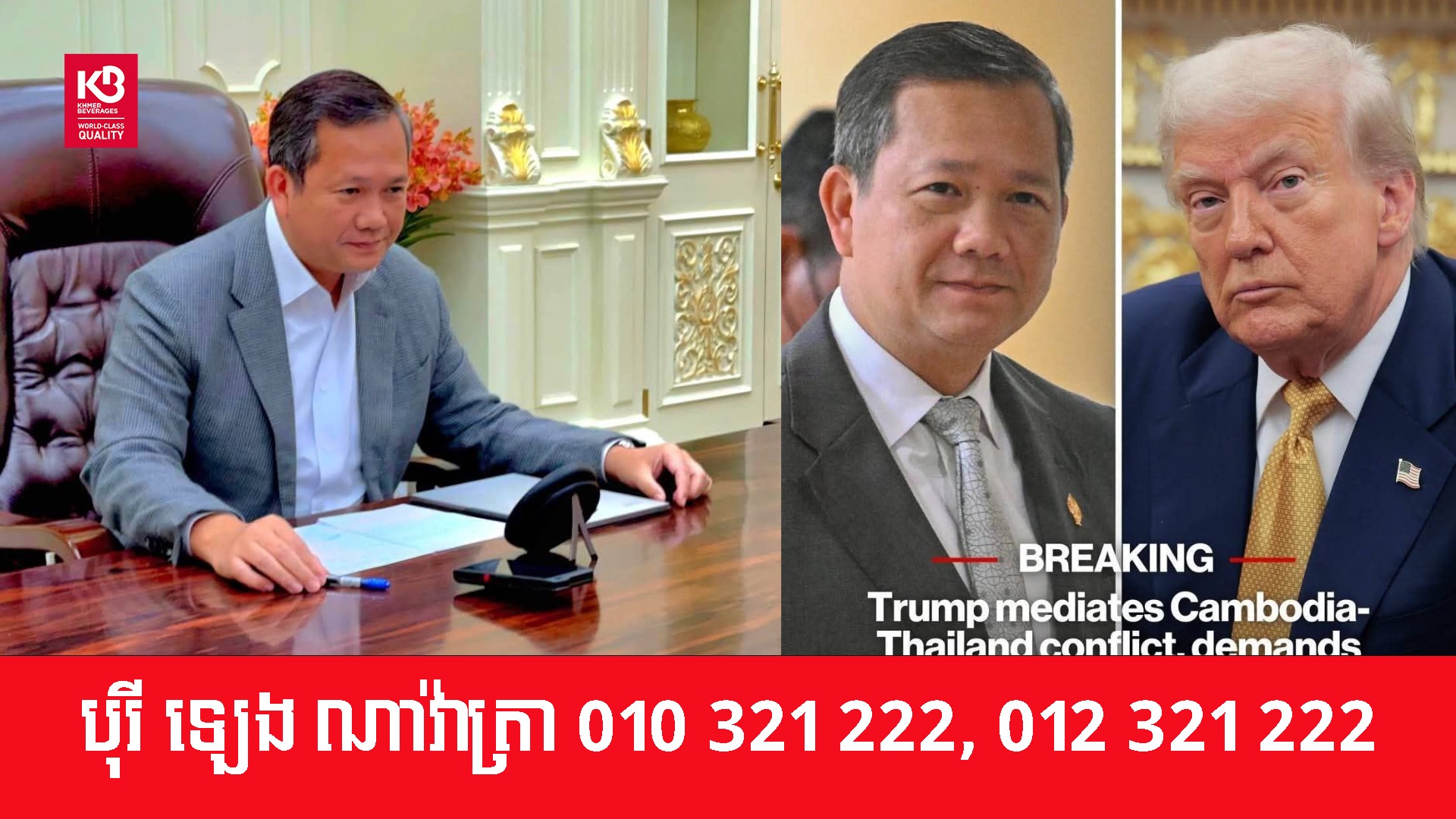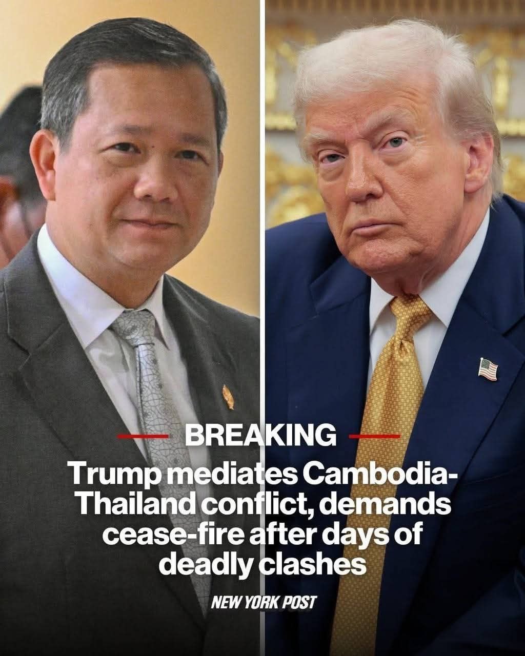 ជាដំណឹងល្អដែលខ្ញុំបានទទួលពីឯកឧត្តម Donald Trump ក្រោយពីឯកឧត្តមបានពិភាក្សាជាមួយឯកឧត្តម Phumtham Wechayachai នាយករដ្ឋមន្ត្រីស្តីទីថៃ គឺភាគីថៃបានឯកភាពជាមួយសំណើរបស់ឯកឧត្តមប្រធានាធិបតី ស្តីពីការឈប់បាញ់គ្នាភ្លាមផងដែរ។ នេះគឺជាដំណឹងដ៏ល្អសម្រាប់កងទ័ពនិងប្រជាជននៃប្រទេសទាំងពីរ។