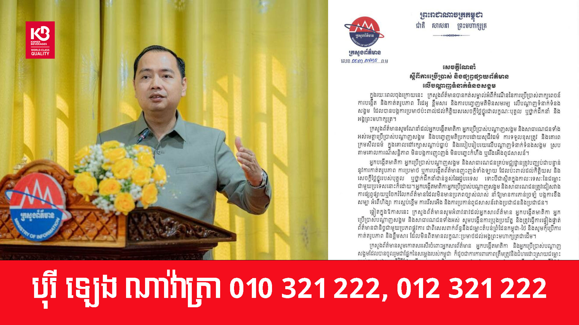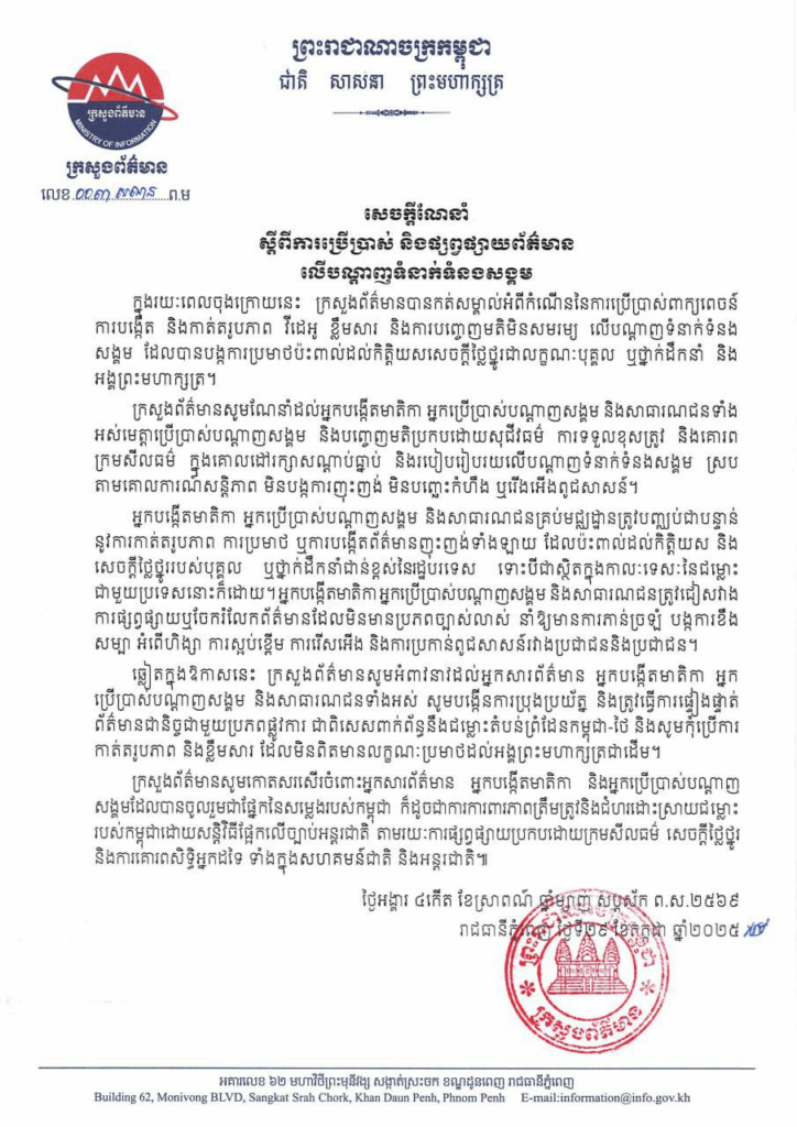 នៅថ្ងៃទី២៩ ខែកក្កដា ឆ្នាំ២០២៥នេះ ក្រសួងព័ត៌មាន ចេញបានចេញសេចក្តីណែនាំដល់អ្នកបង្កើតមាតិកា អ្នកប្រើប្រាស់បណ្តាញសង្គម និងសាធារណជនទាំង អស់មេត្តាប្រើប្រាស់បណ្តាញសង្គម និងបញ្ចេញមតិប្រកបដោយសុជីវធម៌ ការទទួលខុសត្រូវ និងគោរព ក្រមសីលធម៌ ក្នុងគោលដៅរក្សាសណ្តាប់ធ្នាប់ និងរបៀបរៀបរយលើបណ្តាញទំនាក់ទំនងសង្គម ស្រប តាមគោលការណ៍សន្តិភាព មិនបង្កការញុះញង់ មិនបញ្ឆេះកំហឹង ឬរើងអើងពូជសាសន៍។