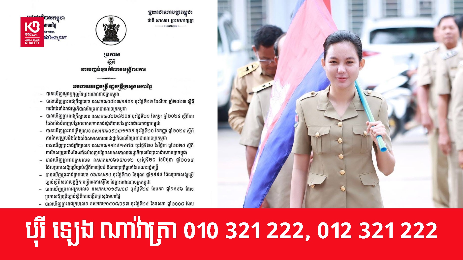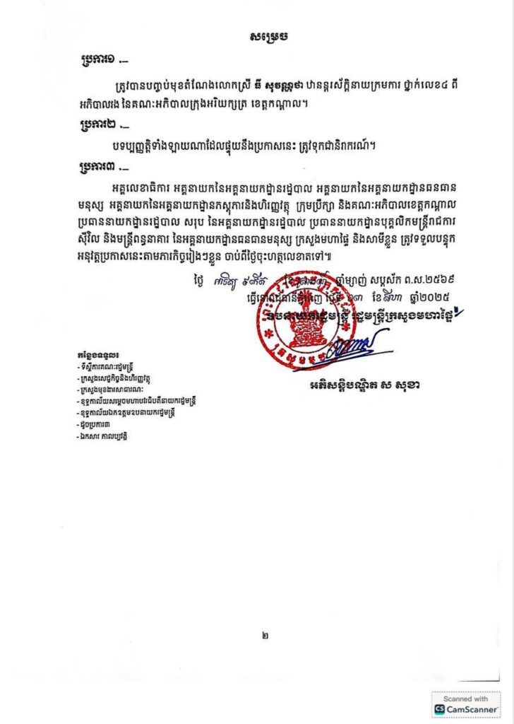 ឧបនាយករដ្ឋមន្ត្រី ស សុខា ចេញប្រកាសបញ្ចប់តំណែងលោកស្រី ធី សុវណ្ណថា ពីអភិបាលរងក្រុងអរិយក្សត្រ ខេត្តកណ្តាល
