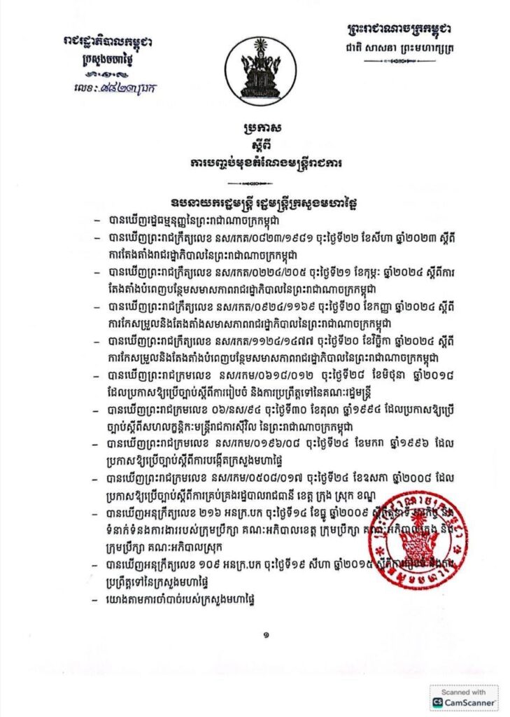 ឧបនាយករដ្ឋមន្ត្រី ស សុខា រដ្ឋមន្ត្រីក្រសួងមហាផ្ទៃ នៅរសៀលថ្ងៃទី៣ ខែសីហា ឆ្នាំ២០២៥នេះ បានចេញប្រកាសបញ្ចប់មុខតំណែង លោកស្រី ធី សុវណ្ណថា ពីអភិបាលរង នៃគណៈអភិបាលក្រុងអរិយក្សត្រ ខេត្តកណ្តាល។