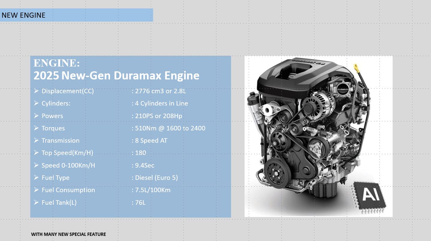 រថយន្ត All-New Chevrolet Colorado 2025 មិនមែនគ្រាន់តែជារថយន្តភីកអាប់ទូទៅប៉ុណ្ណោះទេ ប៉ុន្តែជារថយន្តភីកអាប់ដែលផ្តល់អោយអិតិថនអ្វីដែលថ្មី នេះជាហេតុផលមួយចំនួនដូចជា ជាមួយនឹងកម្លាំងដ៏ខ្លាំងក្លា Chevrolet Colorado ម៉ូដែលស៊េរីឆ្នាំ 2025 បំពាក់ដោយម៉ាស៊ីន 2.8L TurboMax ជំនាន់ថ្មី ផ្តល់កម្លាំងសេះ និងកម្លាំងបង្វិលជុំខ្ពស់។ មិនថាការបើកបរផ្លូវទីក្រុង ទីប្រជុំជន តាមជនបទឬផ្លូវលំបាក Off-Road រថយន្ត Chevroletជំនាន់ ថ្មីនេះអាចធ្វើបានទាំងអស់ និងអាចគ្រប់គ្រងបានដោយទំនុកចិត្ត។