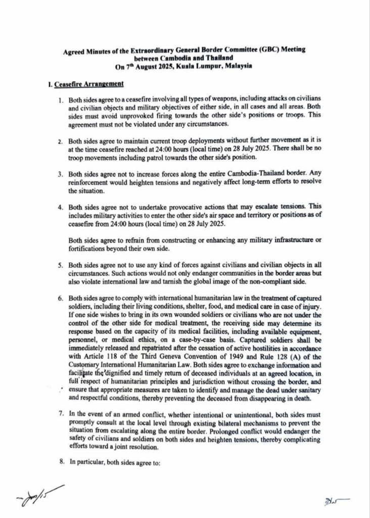 យោងតាមសេចក្ដីថ្លែងការណ៍រួម នៃកិច្ចប្រជុំវិសាមញ្ញនៃគណៈកម្មាធិការព្រំដែនទូទៅ (GBC) នៅទីក្រុងកូឡាឡាំពួរ ប្រទេសម៉ាឡេស៊ីនារសៀលថ្ងៃទី០៧ ខែសីហា ឆ្នាំ២០២៥ ដោយក្រសួងការពារជាតិ បានបង្ហាញឱ្យដឹងថា ប្រទេសកម្ពុជា និងប្រទេសថៃ បានចុះកិច្ចព្រមព្រៀងគ្នា១៣ចំណុចសំខាន់ៗ។