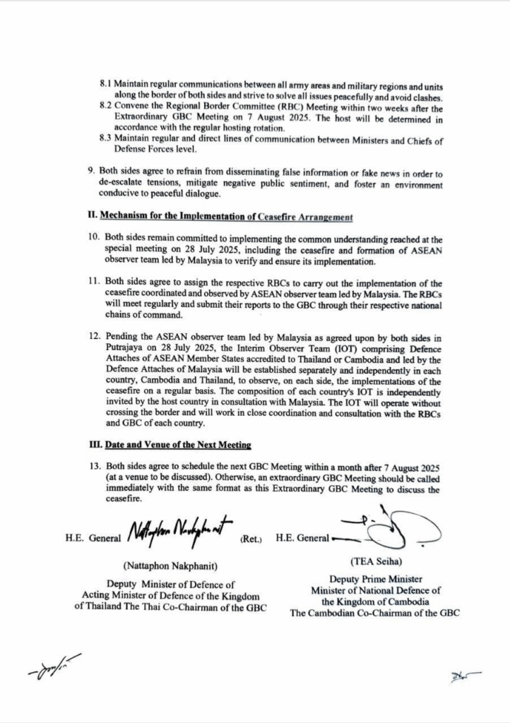 ១២. យោងទៅលើក្រុមអ្នកអង្កេតការណ៍អាស៊ានដឹកនាំដោយម៉ាឡេស៊ីតាមការឯកភាពគ្នាដោយភាគីទាំងសងខាងក្នុងទីក្រុងគូឡាឡាំពួ កាលពីថ្ងៃទី២៨ ខែកក្កដា ឆ្នាំ២០២៥ ក្រុមអ្នកអង្កេតការណ៍បណ្ដោះអាសន្ន (IOT) រួមមានអនុព័ន្ធយោធានៃរដ្ឋជាសមាជិកអាស៊ានដែលទទួលស្គាល់ដោយកម្ពុជា ឬថៃ ដឹកនាំដោយអនុព័ន្ធយោធា ម៉ាឡេស៊ី នឹងត្រូវបានបង្កើតឡើងដាច់ដោយឡែកពីគ្នា និងដោយឯករាជ្យ ក្នុងប្រទេសទាំងសងខាង កម្ពុជា និងថៃ ដើម្បីត្រួតពិនិត្យលើភាគីម្ខាងៗ លើការអនុវត្ត បទឈប់បាញ់ផ្អែកលើមូលដ្ឋានជាទៀតទាត់។ សមាសភាព IOT នៃប្រទេសនីមួយៗត្រូវបានអញ្ជើញដោយឯករាជ្យដោយប្រទេសជាម្ចាស់ផ្ទះនៅក្នុង ការពិគ្រោះយោបល់ជាមួយម៉ាឡេស៊ី។ IOT នឹងធ្វើប្រតិបត្តិការដោយឆ្លងកាត់ព្រំដែន និងធ្វើការក្រោមការសម្របសម្រួល ព្រមទាំងពិគ្រោះយោបល់យ៉ាងជិតស្និទ្ធជាមួយ RBC និង GBC នៃប្រទេសទាំង សងខាង។
