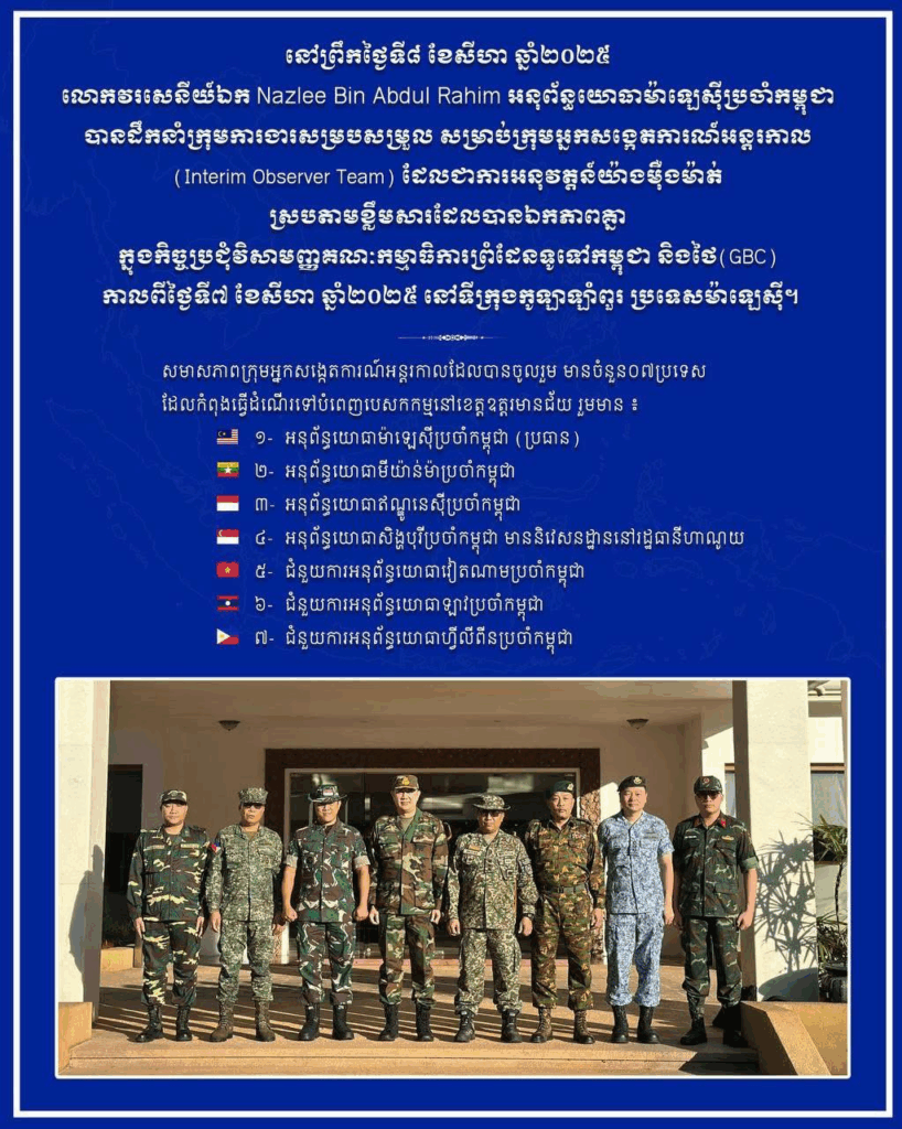 ក្រសួងការពារជាតិនៃកម្ពុជា នៅថ្ងៃទី៨ ខែសីហា ឆ្នាំ២០២៥នេះ បានឱ្យដឹងថា លោកវរសេនីយ៍ឯក Nazlee Bin Abdul Rahim អនុព័ន្ធយោធាម៉ាឡេស៊ីប្រចាំកម្ពុជា នៅព្រឹកថ្ងៃទី៨ ខែសីហានេះបានដឹកនាំក្រុមការងារសម្របសម្រួល សម្រាប់ក្រុមអ្នកសង្កេតការណ៍អន្តរកាល (Interim Observer Team) ដែលជាការអនុវត្តន៍យ៉ាងម៉ឺងម៉ាត់ ស្របតាមខ្លឹមសារដែលបានឯកភាពគ្នា ក្នុងកិច្ចប្រជុំវិសាមញ្ញគណៈកម្មាធិការព្រំដែនទូទៅកម្ពុជា និងថៃ(GBC) កាលពីថ្ងៃទី៧ ខែសីហា ឆ្នាំ២០២៥ នៅទីក្រុងកូឡាឡាំពួរ ប្រទេសម៉ាឡេស៊ី។