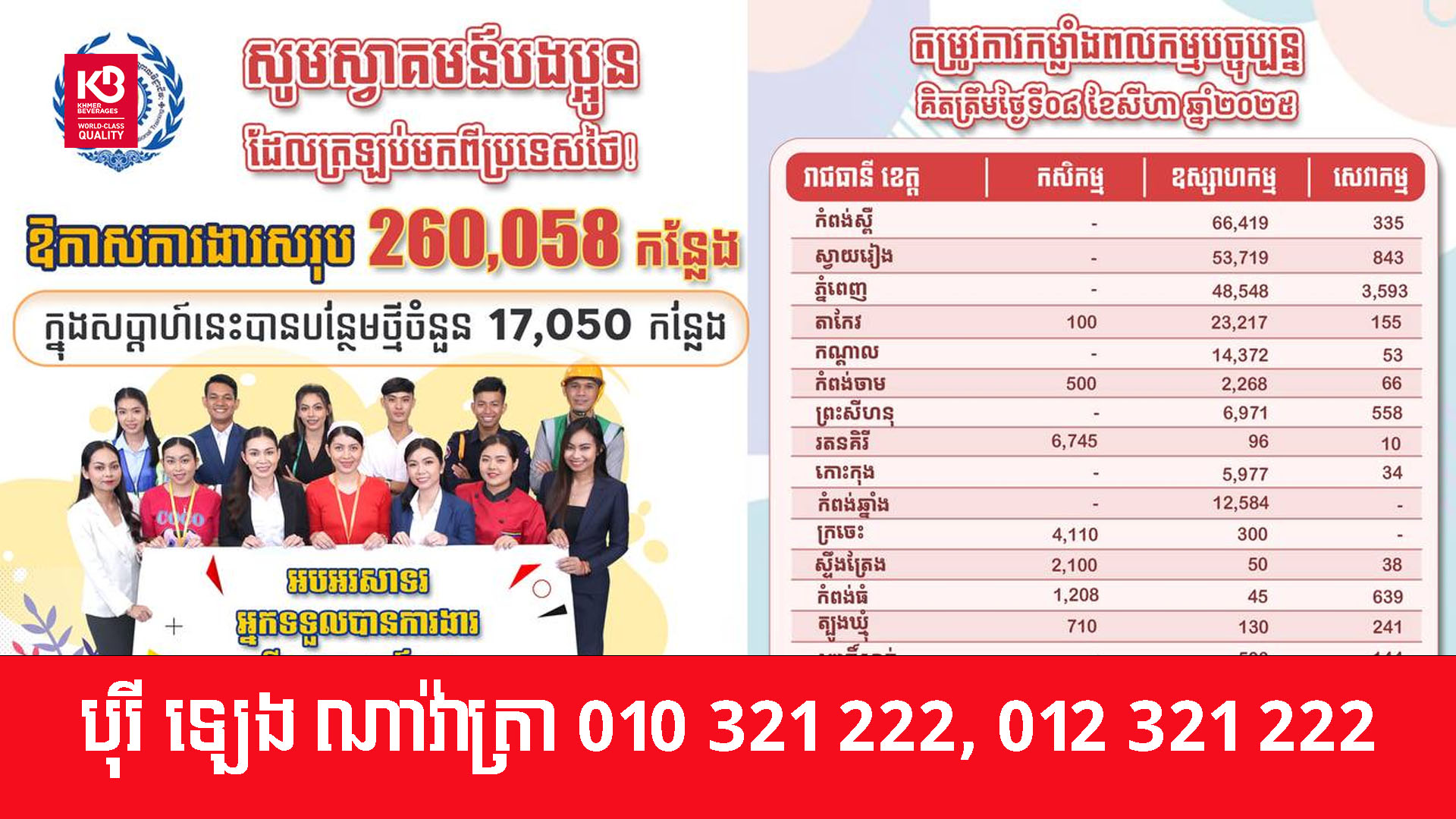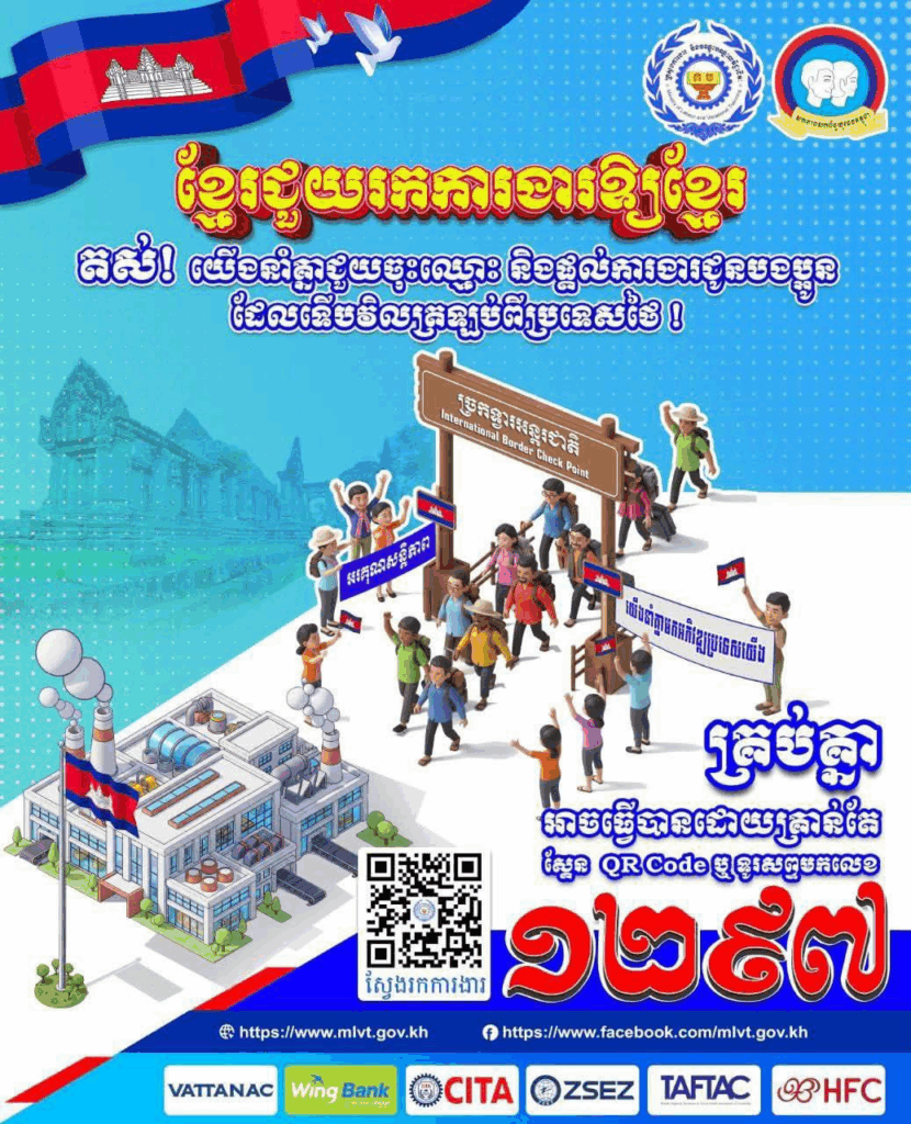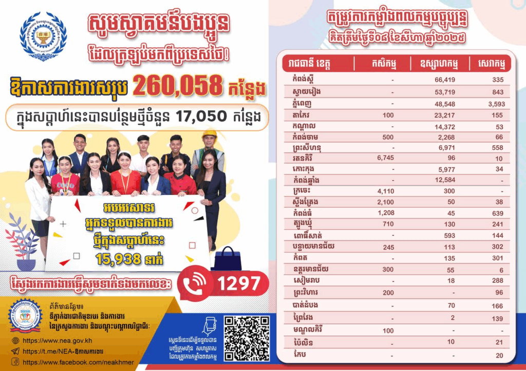 ក្រសួងការងារ និងបណ្ដុះបណ្ដាលវិជ្ជាជីវៈ បានបន្ដប្រកាសផ្ដល់ឱកាសការងារជាច្រើនម៉ឺនកន្លែងជូនដល់បងប្អូនប្រជាពលរដ្ឋដែលត្រឡប់ពីប្រទេសថៃ ចូលមកមាតុប្រទេសវិញ។