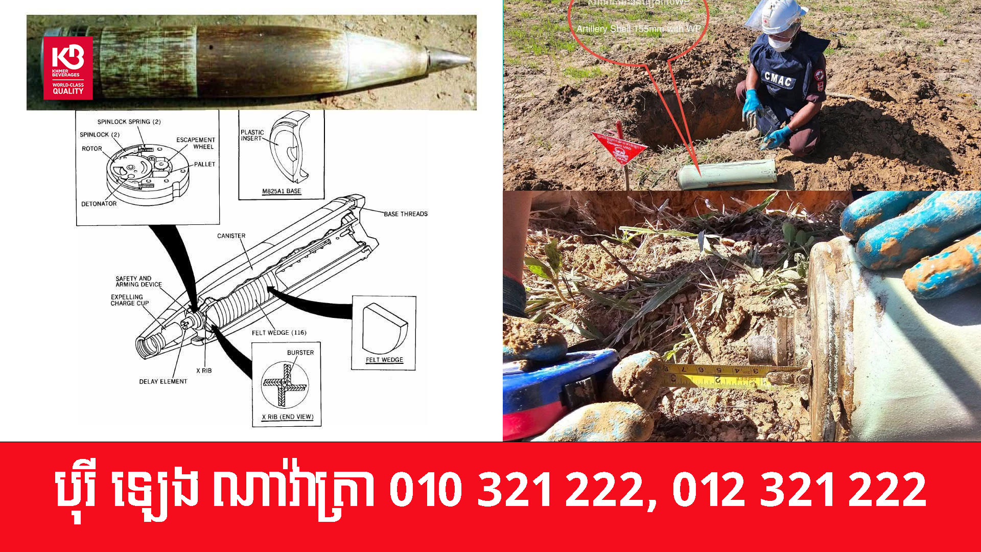 លោកបានសង្កត់ធ្ងន់ថា គ្រាប់ផ្លោង១៥៥មមនេះ មានលេខ THS856105-011 155MM M825 បានប្រទះឃើញនៅតំបន់វាលស្រែប្រជាពលរដ្ឋស្ថិតនៅភូមិសាស្ត្រស្រុកបន្ទាយអំពិល ខេត្តឧត្តររមានជ័យ។