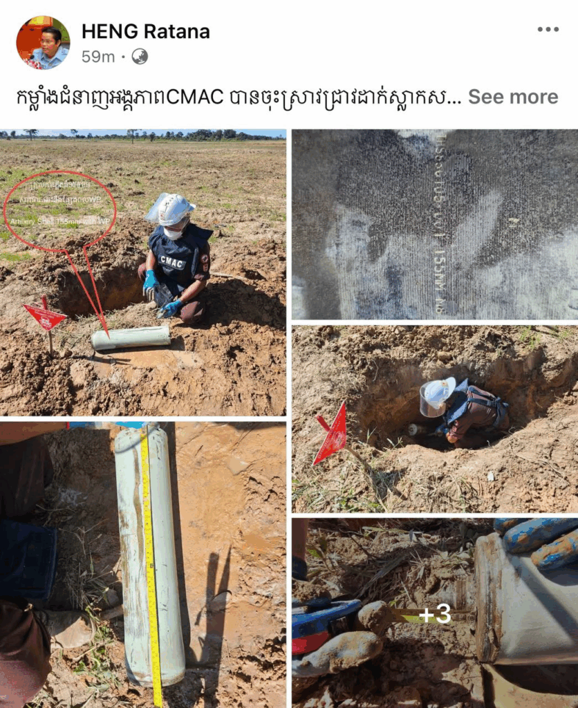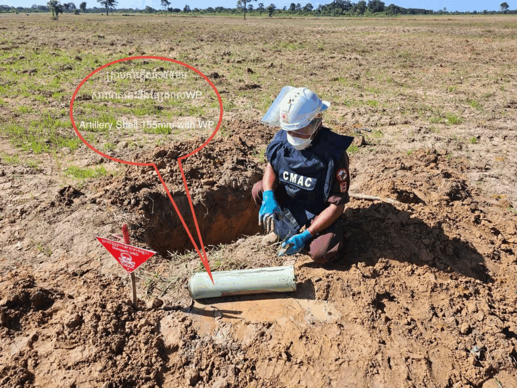 លោក ហេង រតនា អគ្គនាយកស៊ីម៉ាក់កម្ពុជា នៅល្ងាចថ្ងៃទី១៤ ខែសីហា ឆ្នាំ២០២៥នេះ បានបញ្ជាក់ថា កម្លាំងជំនាញ CMAC ប្រទះឃើញគ្រាប់ផ្សែងប្រភេទគ្រាប់ផ្លោង១៥៥មម មានផ្ទុកសារធាតុឆេះ និងផ្សែងពុលប្រភេទ White Phosphorus(WP)។