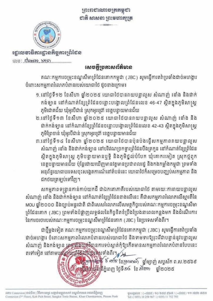 រដ្ឋលេខាធិការដា្ឋនកិច្ចការព្រំដែន នៅថ្ងៃទី១៤ ខែសីហា ឆ្នាំ២០២៥ បានចេញសេចក្ដីប្រកាសព័ត៌មាន លើកឡើងពីសកម្មភាពបំពានរបស់យោធាថៃបីចំណុចសំខាន់ៗ និងបានចាត់ទុកទង្វើទាំងនេះ ជាការរំលោភលើស្មារតីនៃ MOU ឆ្នាំ២០០០ និងច្បាប់អន្តរជាតិ។