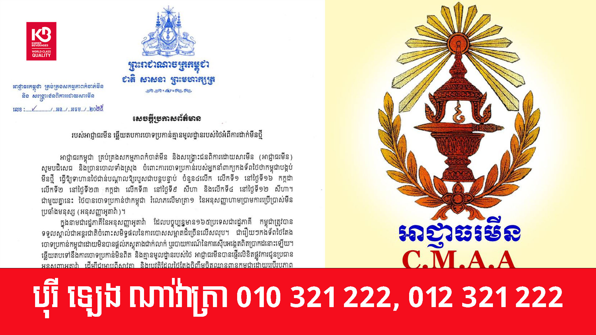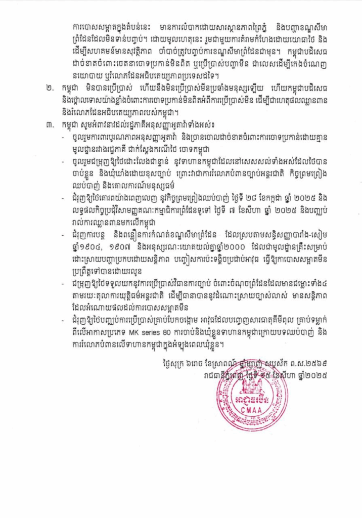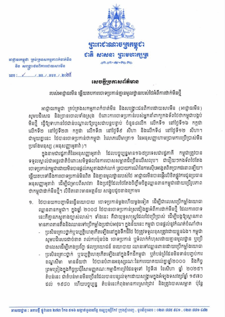 អាជ្ញាធរកម្ពុជា គ្រប់គ្រងសកម្មភាពកំចាត់មីន និងសង្គ្រោះជនពិការដោយសារមីន (អាជ្ញាធរមីន) នៅថ្ងៃទី១៥ ខែសីហា ឆ្នាំ២០២៥នេះ បានចេញសេចក្ដីប្រកាសព័ត៌មានបដិសេធ និងច្រានចោលទាំងស្រុង ចំពោះការចោទប្រកាន់របស់អ្នកនាំពាក្យកងទ័ពថៃថាកម្ពុជាបង្កប់មីនថ្មី ធ្វើឱ្យទាហានថៃជាន់បណ្តាលឱ្យរបួសជាបន្តបន្ទាប់។
