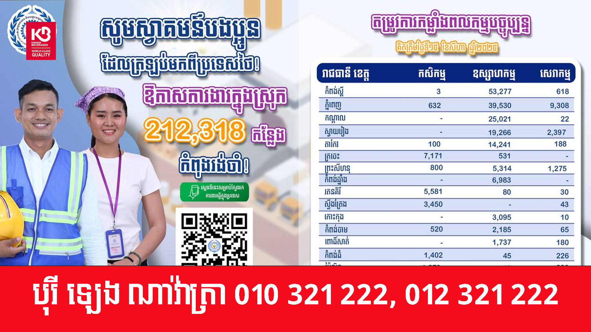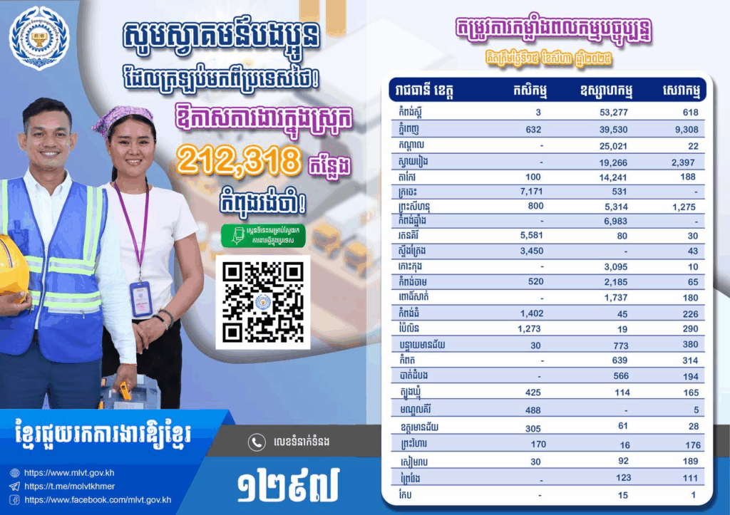 ក្រសួងការងារ និងបណ្ដុះបណ្ដាលវិជ្ជាជីវៈ នៅថ្ងៃទី១៥ ខែសីហា ឆ្នាំ២០២៥ បានជូនដំណឹងពីឱកាសការងារជាច្រើនម៉ឺនកន្លែងជូនដល់បងប្អូនប្រជាពលរដ្ឋខ្មែរទាំងអស់ ជាពិសេសបងប្អូនពលករខ្មែរ ដែលទើបវិលត្រឡប់ពីប្រទេសថៃវិញ។