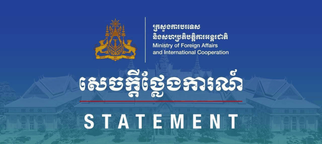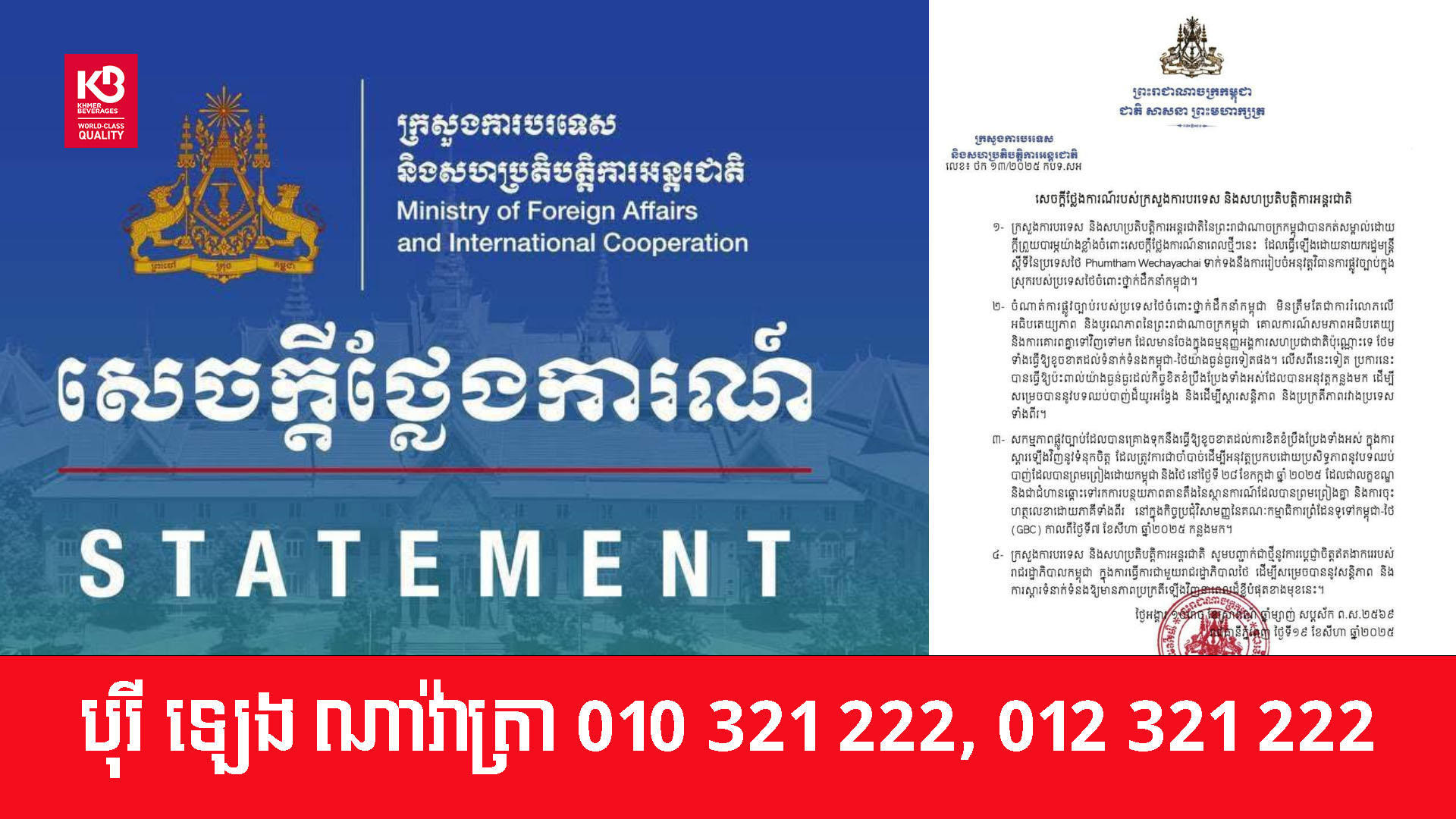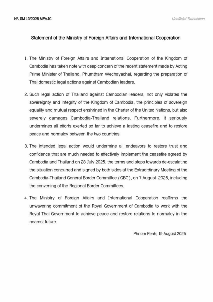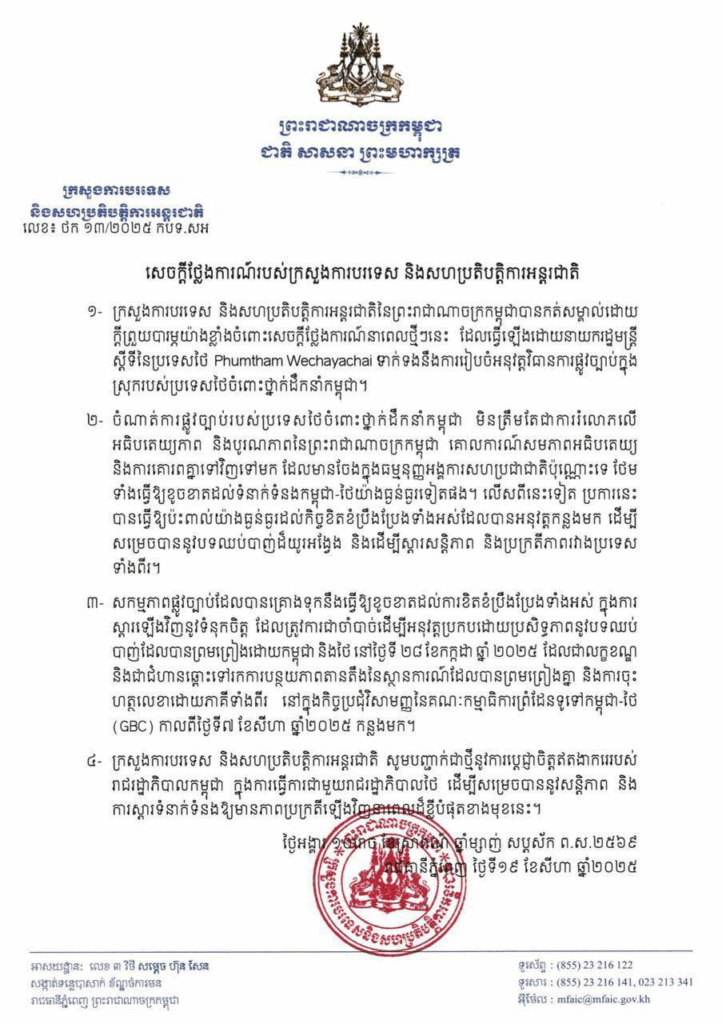 ក្រសួងការបរទស និងសហប្រតិបត្តិការអន្តរជាតិ នៅរសៀលថ្ងៃទី១៩ ខែសីហា ឆ្នាំ២០២៥នេះ បានចេញសេចក្ដីថ្លែងការណ៍ ដោយបានកត់សម្គាល់ដោយក្តីព្រួយបារម្ភយ៉ាងខ្លាំងចំពោះសេចក្ដីថ្លែងការណ៍នាពេលថ្មីៗនេះ ដែលធ្វើឡើងដោយនាយករដ្ឋមន្ត្រី ស្តីទីនៃប្រទេសថៃ Phumtham Wechayachai ទាក់ទងនឹងការរៀបចំអនុវត្តវិធានការផ្លូវច្បាប់ក្នុងស្រុករបស់ប្រទេសថៃចំពោះថ្នាក់ដឹកនាំកម្ពុជា។
