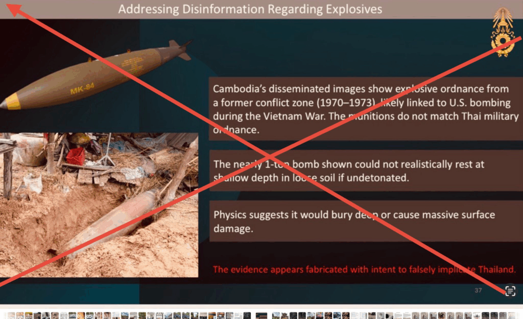 លោកបានលើកឡើងថា «សំណល់គ្រាប់បែកទម្លាក់ពីយន្តហោះF-16 ប្រភេទMK-84 ទម្ងន់ជិតមួយតោន​ ខិតខំប្រែក្លាយខ្លួនជាជនរងគ្រោះថា​ កម្ពុជាខូចរកស៊ីលាបពណ៌​ថៃ​ដោយយកគ្រាប់បែកMK-84 សំណល់សង្គ្រាមឆ្នាំ១៩៧០-១៩៧៣​ មកដាក់តាំងបង្ហាញ​ ប៉ុន្តែជាក់ស្តែងគ្រាប់បែកMK-84 ស្ថិតនៅភូមិថ្មដូន​ ឃុំគោកមននេះ​ ផលិតឆ្នាំ១៩៩៦​ ហើយគ្រាប់បែកMK-82ទម្លាក់នៅវត្តតាមន្តសែនជ័យផលិតនៅឆ្នាំ២០២៣! តើគ្រាប់បែកផលិតនៅឆ្នាំ១៩៩៦និង២០២៣​ អាចជាសំណល់សង្គ្រាមឆ្នាំពី១៩៧០-១៩៧៣កើតដែរឬ?