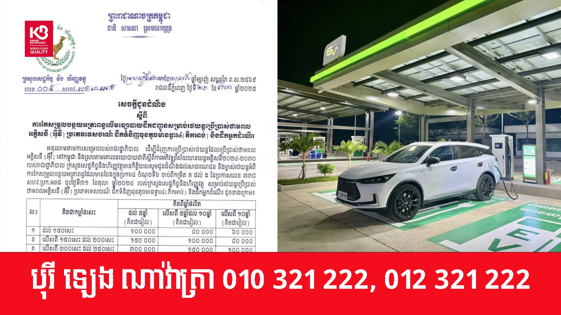 ក្រសួងសេដ្ឋកិច្ច និងហិរញ្ញវត្ថុ នៅថ្ងៃទី២១ ខែសីហា ឆ្នាំ២០២៥ បានចេញសេចក្តីជូនដំណឹងពី ការកែសម្រួលបន្ថយអត្រាពន្ធលើមធ្យោបាយដឹកជញ្ជូន សម្រាប់រថយន្តប្រើប្រាស់ថាមពលអគ្គិសនី (EV) ប្រភេទទេសចរណ៍ ដឹកទំនិញធុនតូចមានទ្វារ៤ (ភិកអាប់) និងរថយន្តដឹកអ្នកដំណើរ។