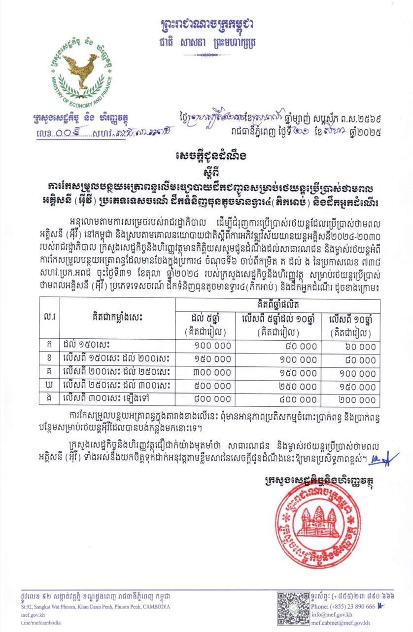 សេចក្តីជូនដំណឹងរបស់ក្រសួងសេដ្ឋកិច្ច និងហិរញ្ញវត្ថុ បានបញ្ជាក់ថា ការកែសម្រួលបន្ថយអត្រាពន្ធដែលមានចែងក្នុងប្រការ៤ ចំណុចទី៦ ចាប់ពីកម្រិត គ ដល់ ង នៃប្រកាសលេខ ៧៣៨ សហវ.ប្រក.អពដ ចុះថ្ងៃទី៣១ ខែតុលា ឆ្នាំ២០២៤ របស់ក្រសួងសេដ្ឋកិច្ចនិងហិរញ្ញវត្ថុ សម្រាប់រថយន្តប្រើប្រាស់ ថាមពលអគ្គិសនី (អ៊ីវី) ប្រភេទទេសចរណ៍ ដឹកទំនិញធុនតូចមានទ្វារ៤(ភិកអាប់) និងដឹកអ្នកដំណើរ គិតជាកម្លាំងសេះ ដល់ ១៥០សេះ រហូតលើសពី ៣០០សេះឡើងទៅ និងថ្លៃបង់ពី ៦០,០០០រៀល រហូតដល់ ៨០០,០០០រៀល៕