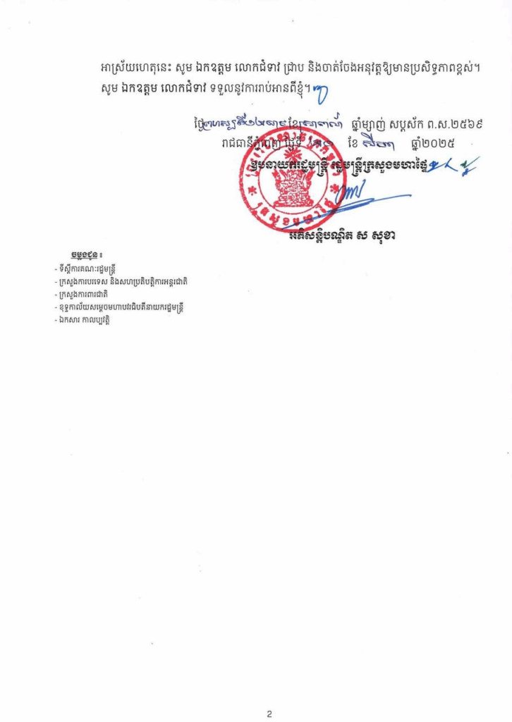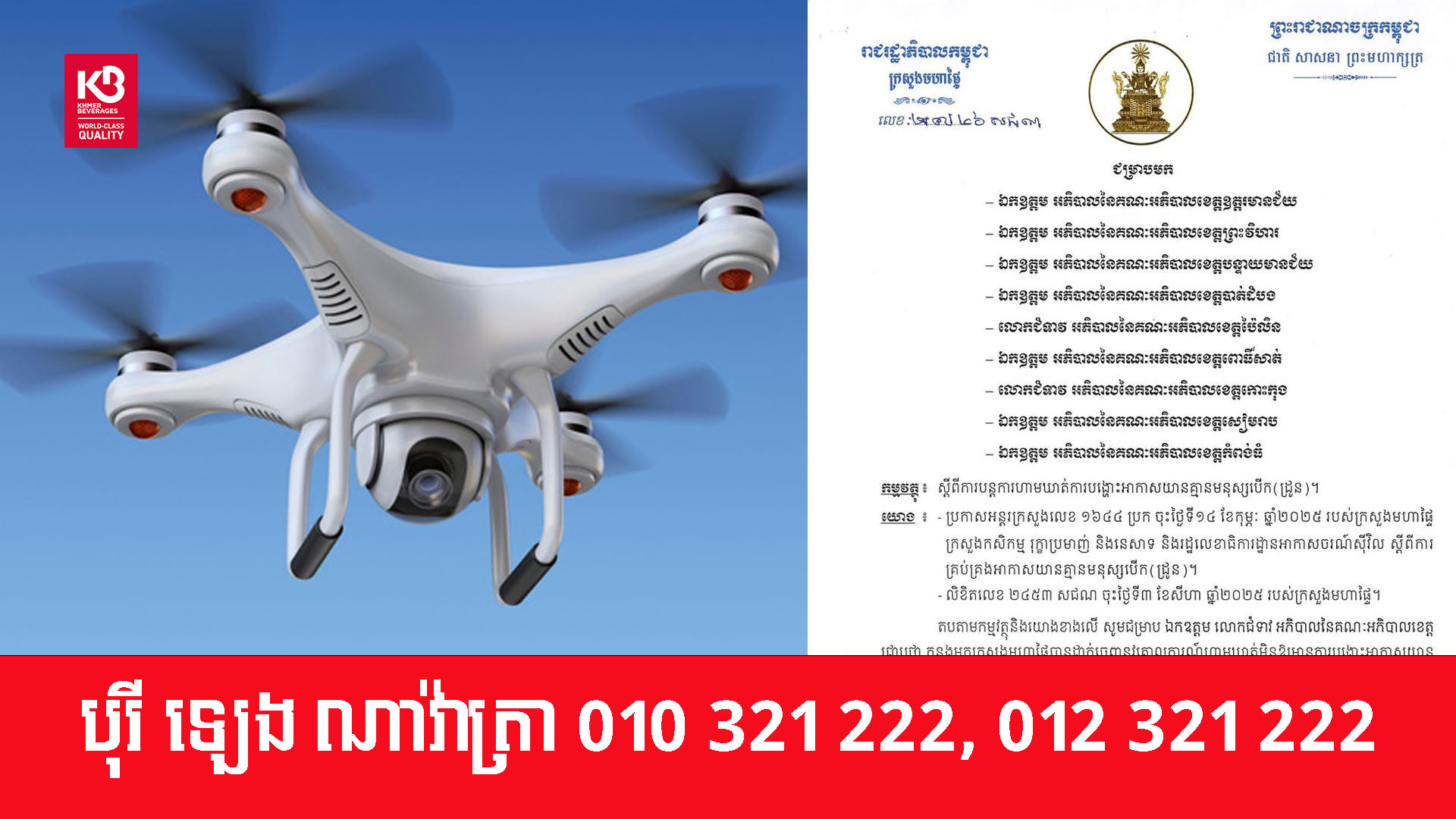 យោងតាមលិខិតចុះថ្ងៃទី២០ ខែសីហា ឆ្នាំ២០២៥ បានឱ្យដឹងថា កន្លងមកក្រសួងមហាផ្ទៃបានដាក់ចេញនូវគោលការណ៍ហាមឃាត់មិនឱ្យមានការបង្ហោះអាកាសយាន គ្មានមនុស្សបើក(ដ្រូន) នៅក្នុងភូមិសាស្ត្រខេត្តឧត្តរមានជ័យ ខេត្តព្រះវិហារ ខេត្តបន្ទាយមានជ័យ ខេត្តបាត់ដំបង ខេត្តប៉ៃលិន ខេត្តពោធិ៍សាត់ ខេត្តកោះកុង ខេត្តសៀមរាប និងខេត្តកំពង់ធំ សម្រាប់រយៈពេល១៥ថ្ងៃ ដោយគិតចាប់ពីថ្ងៃទី៣ ខែសីហា ឆ្នាំ២០២៥។