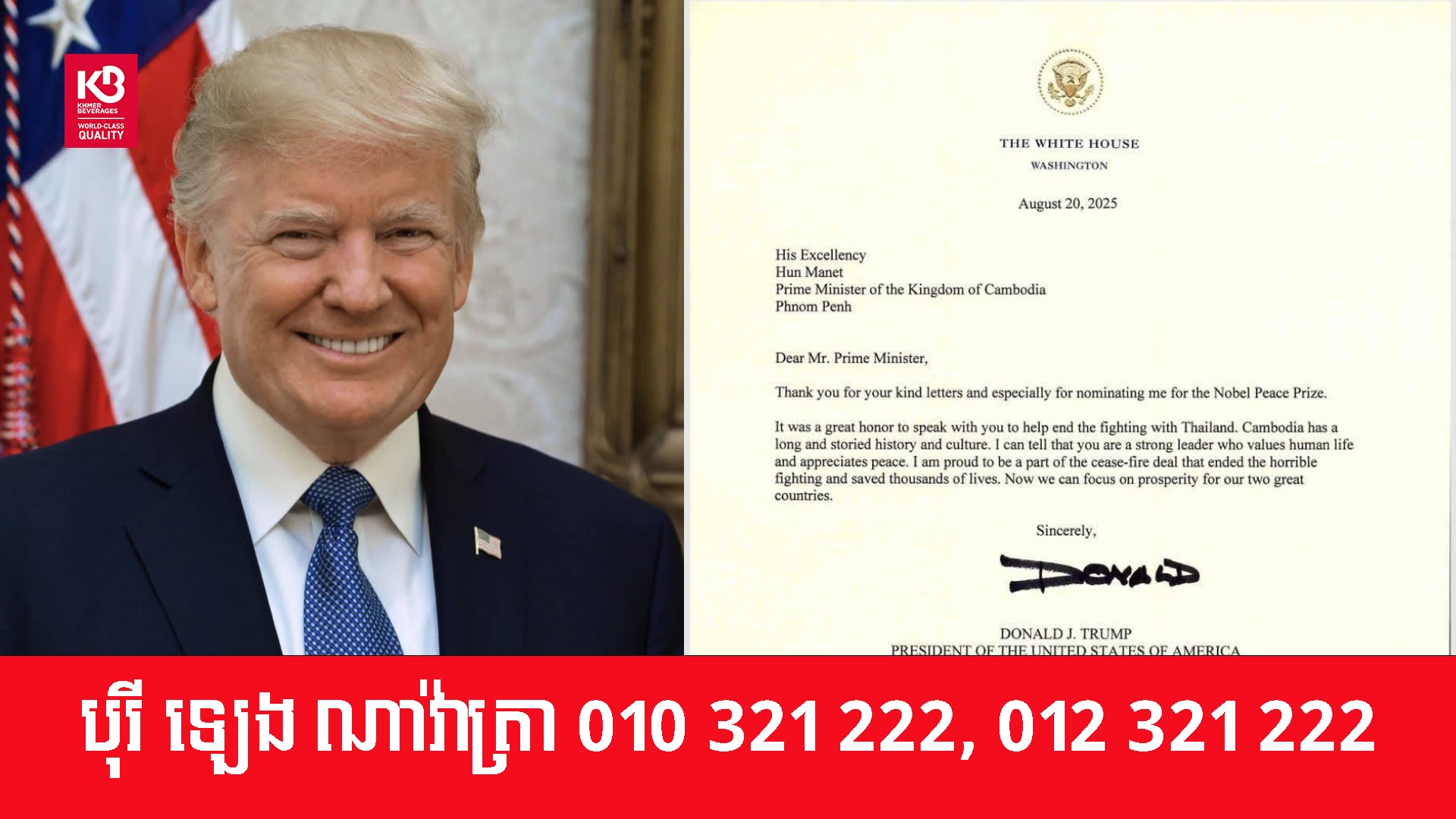 គួររំឭកថា កាលថ្ងៃទី៧ ខែសីហា ឆ្នាំ២០២៥ សម្តេចធិបតី ហ៊ុន ម៉ាណែត បានផ្ញើលិខិតផ្លូវការទៅកាន់គណៈកម្មាធិការណូបែលន័រវែស ដើម្បីគាំទ្រ និងតែងតាំងប្រធានាធិបតីសហរដ្ឋអាមេរិក លោក ដូណាល់ ត្រាំ សម្រាប់ពានរង្វាន់ណូបែលសន្តិភាព។ ចំពោះនាយករដ្ឋមន្ត្រីកម្ពុជា យល់ឃើញថា លោក ដូណាល់ ត្រាំ បានរួមចំណែកយ៉ាងសំខាន់ជាប្រវត្តិសាស្ត្រ ក្នុងកិច្ចខិតខំប្រឹងប្រែងសម្របសម្រួលឱ្យមានបទឈប់បាញ់រវាងកម្ពុជា-ថៃ ពិសេសការស្វែងរកសន្តិភាពតាមព្រំដែននៃប្រទេសទាំងពីរ៕