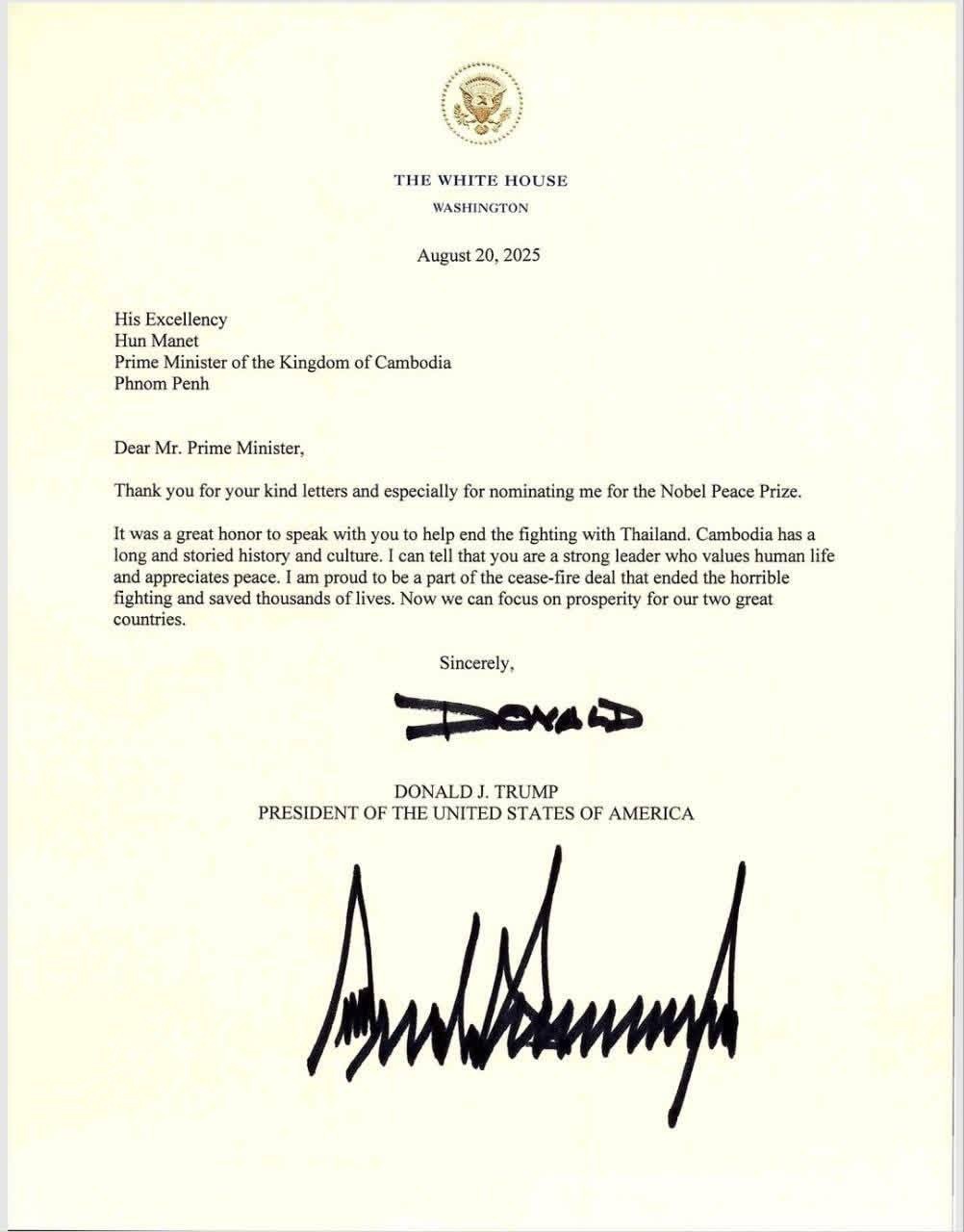 លោក ដូណាល់ ត្រាំ (Donald J. Trump) ប្រធានាធិបតីសហរដ្ឋអាមេរិក នៅថ្ងៃទី២០ ខែសីហា ឆ្នាំ២០២៥ បានផ្ញើសារលិខិតថ្លែងអំណរគុណ សម្តេចធិបតី ហ៊ុន ម៉ាណែត នាយករដ្ឋមន្ត្រីកម្ពុជា ចំពោះលិខិតដ៏កក់ក្តៅរបស់សម្តេច និងជាពិសេស ការស្នើរូបលោក សម្រាប់ពានរង្វាន់ ណូបែលសន្តិភាព។