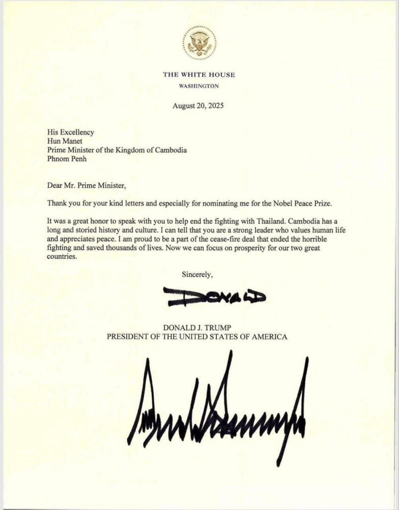 កាលយប់ថ្ងៃទី ២៧ ខែសីហា ឆ្នាំ២០២៥ សម្តេចធិបតី ហ៊ុន ម៉ាណែត បានបង្ហោះលិខិតរបស់ប្រធានាធិបតីសហរដ្ឋអាមេរិក លោក Donald Trump ដែលបានផ្ញើលិខិតថ្លែងអំណរគុណ ជូនសម្តេចដោយលិខិតរបស់លោក ដូណាល់ ត្រាំ មានខ្លឹមសារដូច្នេះថា៖«ខ្ញុំសូមអរគុណ ចំពោះលិខិតដ៏កក់ក្តៅរបស់ឯកឧត្តម (សម្តេចធិបតី ហ៊ុន ម៉ាណែត) និងជាពិសេសការស្នើរូបខ្ញុំ សម្រាប់ពានរង្វាន់ ណូបែលសន្តិភាព»។