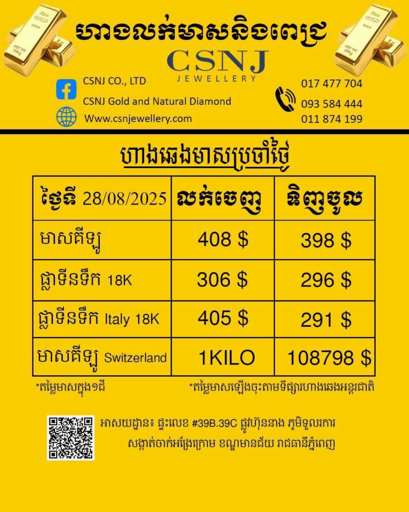 តម្លៃមាសនៅថ្ងៃទី២៨ ខែសីហា ឆ្នាំ២០២៥នេះ ចុះថ្លៃបន្ដិចបើធៀបនឹងថ្ងៃម្សិលមិញ ពោលគឺមានតម្លៃ ៤០៨ដុល្លារនៅក្នុងមួយជី ជាតម្លៃលក់ចេញ និងទិញចូលក្នុងតម្លៃ ៣៩៨ដុល្លារ។ នេះបើយោងតាមហាងឆេងតម្លៃមាស ពីហាងមាសពេជ្រ CSNJ នៅថ្ងៃទី២៩ ខែសីហា។