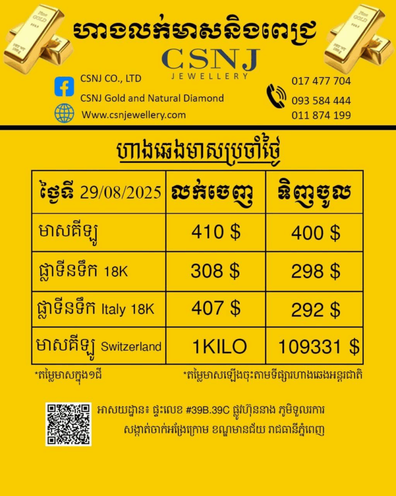 តម្លៃមាសនៅថ្ងៃទី២៩ ខែសីហា ឆ្នាំ២០២៥នេះ ឡើងថ្លៃបន្ដិចបើធៀបនឹងថ្ងៃម្សិលមិញ ពោលគឺមានតម្លៃ ៤១០ដុល្លារនៅក្នុងមួយជី ជាតម្លៃលក់ចេញ និងទិញចូលក្នុងតម្លៃ ៤០០ដុល្លារ។ នេះបើយោងតាមហាងឆេងតម្លៃមាស ពីហាងមាសពេជ្រ CSNJ នៅថ្ងៃទី២៩ ខែសីហា។