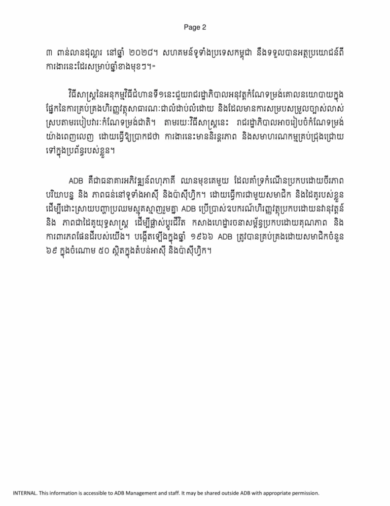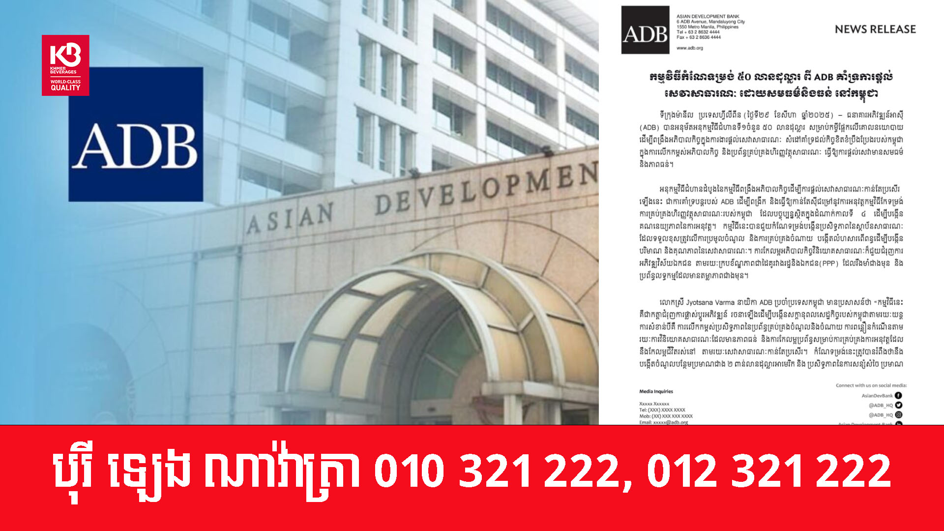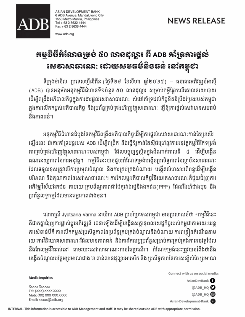 នៅថ្ងៃទី២៩ ខែសីហា ឆ្នាំ២០២៥នេះ ធនាគារអភិវឌ្ឍន៍អាស៊ី (ADB) បានអនុម័តអនុកម្មវិធីជំហានទី១ចំនួន ៥០ លានដុល្លារ សម្រាប់កម្ចីផ្អែកលើគោលនយោបាយ ដើម្បីពង្រឹងអភិបាលកិច្ចក្នុងការងារផ្តល់សេវាសាធារណៈ សំដៅគាំទ្រដល់កិច្ចខិតខំប្រឹងប្រែងរបស់កម្ពុជា ក្នុងការលើកកម្ពស់អភិបាលកិច្ច និងប្រព័ន្ធគ្រប់គ្រងហិរញ្ញវត្ថុសាធារណៈ ធ្វើឱ្យការផ្តល់សេវាមានសមធម៌ និងភាពធន់។