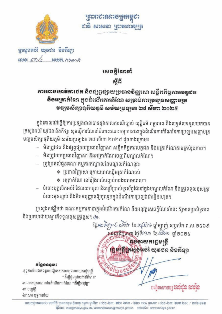 យោងតាមសេចក្ដីណែនាំនេះ បានឱ្យដឹងថា ក្រសួងអប់រំ បានធ្វើការណែនាំចំពោះគណៈកម្មការនានាក្នុងដំណើរការកំណែនៃការប្រឡងសញ្ញាបត្រ មធ្យមសិក្សាទុតិយភូមិ សម័យប្រឡង៖ ២៨ សីហា ២០២៥ ចំនួន៤ចំណុចដូចខាងក្រោម៖ ១, មិនត្រូវថត និងផ្សព្វផ្សាយប្រធានវិញ្ញាសា សន្លឹកកិច្ចការបេក្ខជន និងអត្រាកំណែតាមគ្រប់រូបភាព។ ២, មិនត្រូវយកប្រធានវិញ្ញាសា និងអត្រាកំណែចេញពីមណ្ឌលកំណែ។ ៣, ត្រូវប្រគល់ជូនគណៈកម្មការកណ្ដាលនៃមណ្ឌលកំណែនូវ៖ ប្រធានវិញ្ញាសា ក្រោយពេលធ្វើអត្រាកំណែចប់ និងអត្រាកំណែ នៅរៀងរាល់បញ្ចប់ការងារតាមពេល។ ៤, ចំពោះបុគ្គលិកអប់រំ ដែលយកចូល និងប្រើប្រាស់ទូរស័ព្ទដៃនៅក្នុងមណ្ឌលកំណែ នឹងត្រូវទទួលខុសត្រូវ ចំពោះមុខច្បាប់ និងមិនអនុញ្ញាតឱ្យចូលរួមក្នុងដំណើរការប្រឡងជារៀងរហូត។