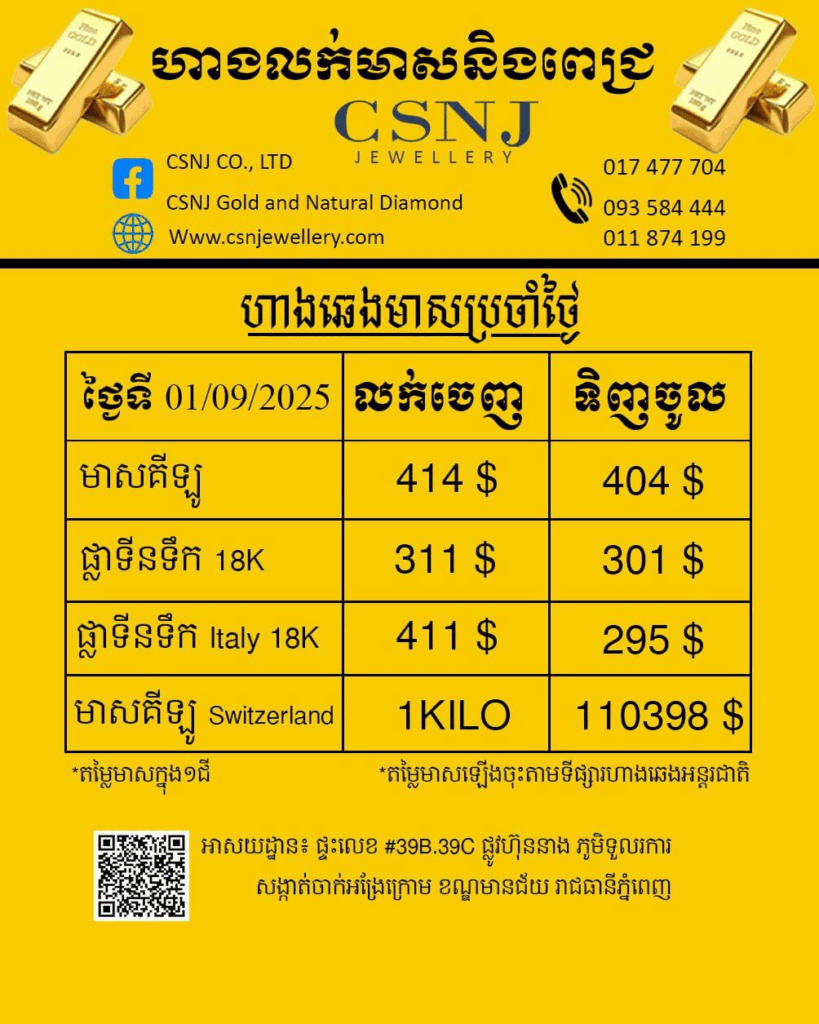 មាសនៅថ្ងៃទី០១ ខែកញ្ញា ឆ្នាំ២០២៥នេះ មានតម្លៃថេរដដែលបើធៀបនឹងចុងខែសីហា ពោលគឺមានតម្លៃ ៤១៤ដុល្លារនៅក្នុងមួយជី ជាតម្លៃលក់ចេញ និងទិញចូលក្នុងតម្លៃ ៤០៤ដុល្លារ។ នេះបើយោងតាមហាងឆេងតម្លៃមាស ពីហាងមាសពេជ្រ CSNJ នៅថ្ងៃទី០១ ខែកញ្ញា។