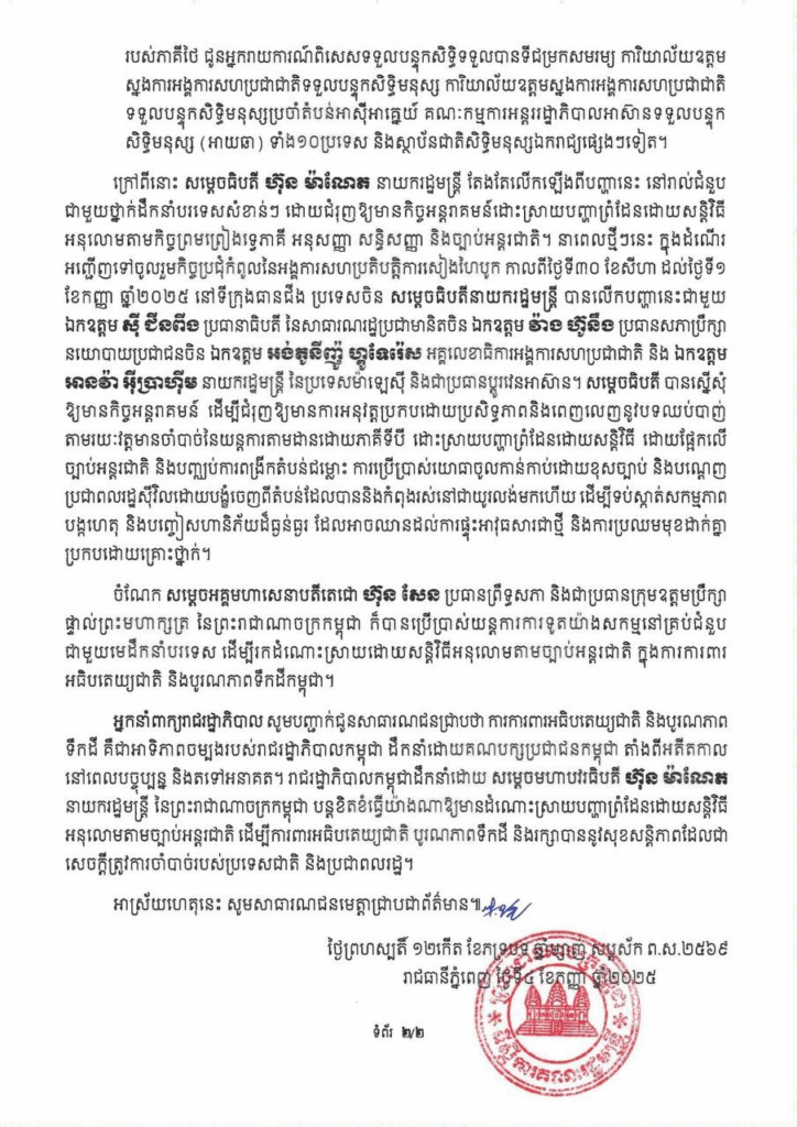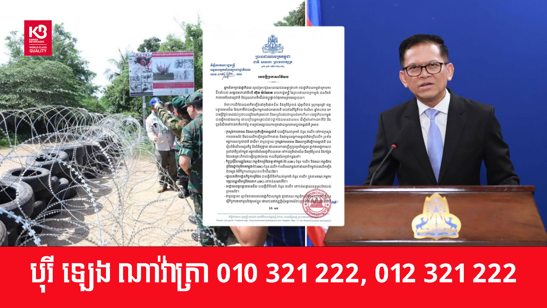 នាថ្ងៃទី៤ ខែកញ្ញា ឆ្នាំ២០២៥នេះ អង្គភាពអ្នកនាំពាក្យរាជរដ្ឋាភិបាល បានចេញសេចក្តីប្រកាសព័ត៌មានថា រាជរដ្ឋាភិបាលកម្ពុជាក្រោមការ ដឹកនាំរបស់ សម្តេចធិបតី ហ៊ុន ម៉ាណែត នាយករដ្ឋមន្ត្រីកម្ពុជា បានខិតខំ ការពារអធិបតេយ្យជាតិ និងបូរណភាពទឹកដីយ៉ាងប្តូរផ្តាច់បំផុតតាមគ្រប់មធ្យោបាយ។