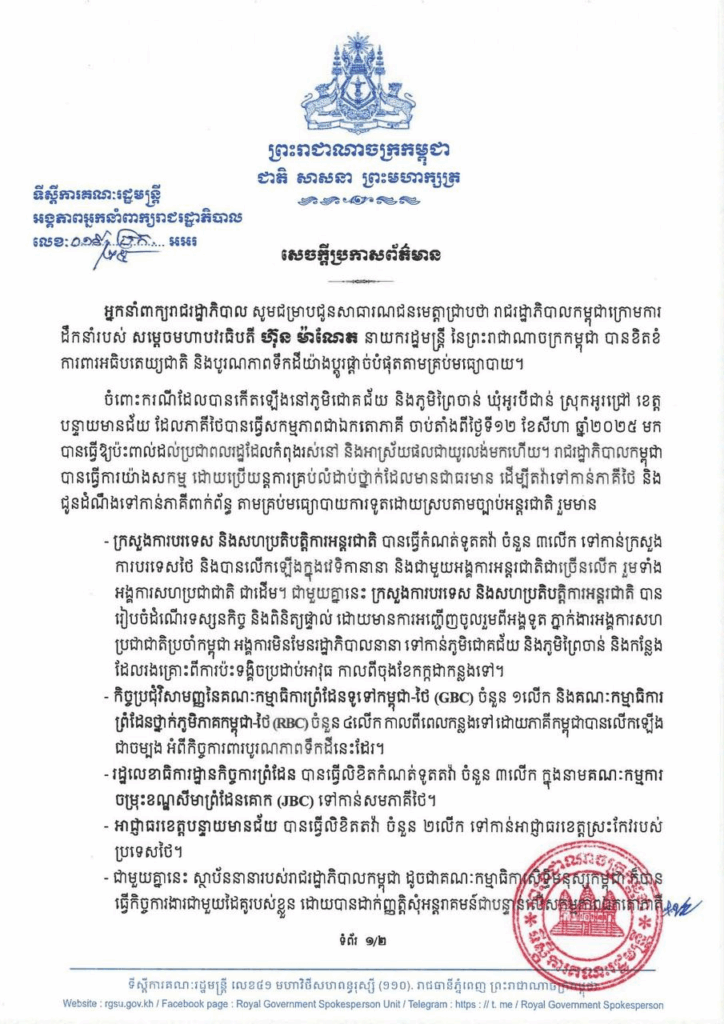 អង្គភាពអ្នកនាំពាក្យរាជរដ្ឋាភិបាលបន្តថា ចំពោះករណីដែលបានកើតឡើងនៅភូមិជោគជ័យ និងភូមិព្រៃចាន់ ឃុំអូរបីជាន់ ស្រុកអូរជ្រៅ ខេត្តបន្ទាយមានជ័យ ដែលភាគីថៃបានធ្វើសកម្មភាពជាឯកតោភាគី ចាប់តាំងពីថ្ងៃទី១២ ខែសីហា ឆ្នាំ២០២៥មក បានធ្វើឱ្យប៉ះពាល់ដល់ប្រជាពលរដ្ឋដែលកំពុងរស់នៅ និងអាស្រ័យផលជាយូរលង់មកហើយ។ រាជរដ្ឋាភិបាលកម្ពុជា បានធ្វើការយ៉ាងសកម្ម ដោយប្រើយន្តការគ្រប់លំដាប់ថ្នាក់ដែលមានជាធរមាន ដើម្បីតវ៉ាទៅកាន់ភាគីថៃ និងជូនដំណឹងទៅកាន់ភាគីពាក់ព័ន្ធ តាមគ្រប់មធ្យោបាយការទូតដោយស្របតាមច្បាប់អន្តរជាតិ រួមមាន៖