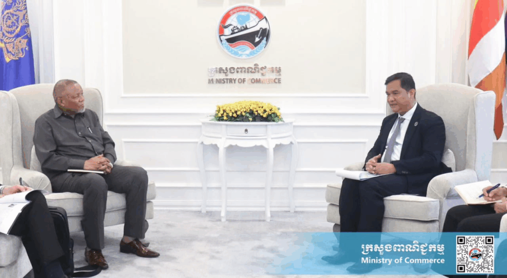 ការស្នើនេះ បានធ្វើឡើងនៅក្នុងជំនួបពិភាក្សារវាងលោក រដ្ឋ សារ៉ាវុធ រដ្ឋលេខាធិការក្រសួងពាណិជ្ជកម្ម ជាមួយ លោក Darkey Ephriam Africa ឯកអគ្គរដ្ឋទូតអាហ្រ្វិកខាងត្បូងប្រចាំកម្ពុជា កាលថ្ងៃទី៤ ខែកញ្ញា ឆ្នាំ២០២៥ ដើម្បីលើកកម្ពស់ទំនាក់ទំនងពាណិជ្ជកម្ម និងសេដ្ឋកិច្ចរវាងប្រទេសទាំងពីរ។