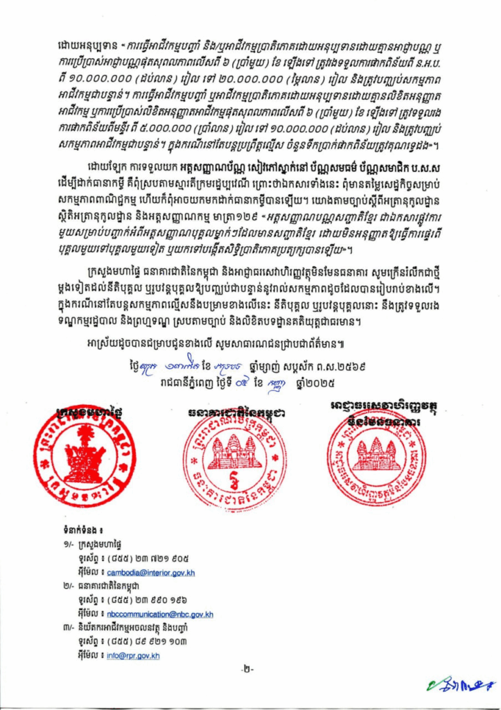 ក្រសួងមហាផ្ទៃ ធនាគារជាតិនៃកម្ពុជា និងអាជ្ញាធរសេវាហិរញ្ញវត្ថុមិនមែនធនាគារ បានក្រើនរំលឹកជាថ្មី ម្តងទៀតដល់នីតិបុគ្គល ឬរូបវន្តបុគ្គលឱ្យបញ្ឈប់ជាបន្ទាន់នូវរាល់សកម្មភាពដូចដែលបានរៀបរាប់ខាងលើ។ ក្នុងករណីនៅតែបន្តសកម្មភាពល្មើសនឹងបម្រាមខាងលើនេះ នីតិបុគ្គល ឬរូបវន្តបុគ្គលនោះ នឹងត្រូវទទួលរង ទណ្ឌកម្មរដ្ឋបាល និងព្រហ្មទណ្ឌស្របតាមច្បាប់ និងលិខិតបទដ្ឋានគតិយុត្តជាធរមាន៕