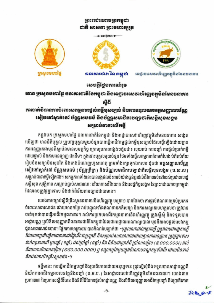 ក្រសួងមហាផ្ទៃ ធនាគារជាតិនៃកម្ពុជា និងអាជ្ញាធរសេវាហិរញ្ញវត្ថុមិនមែនធនាគារ នៅថ្ងៃទី៥ ខែកញ្ញា ឆ្នាំ២០២៥នេះ បានចេញសេចក្ដីថ្លែងការណ៍រួម ស្តីពីការចាត់វិធានការចំពោះសកម្មភាពផ្ដល់កម្ចីខុសច្បាប់ និងការទទួលយកអត្តសញ្ញណប័ណ្ណ សៀវភៅស្នាក់នៅ ប័ណ្ណសមធម៌ និងប័ណ្ណសមាជិកបេឡាជាតិសន្តិសុខសង្គម សម្រាប់ធានាលើកម្ចី។