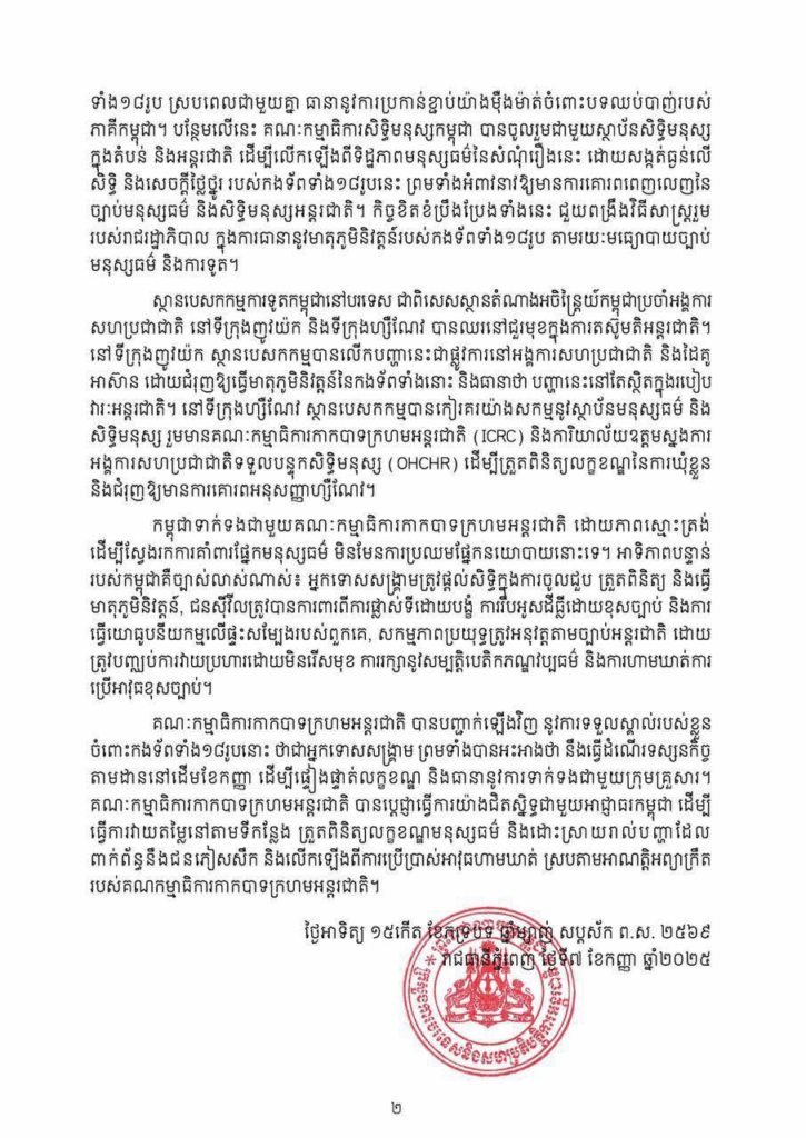 ជាមួយគ្នានោះ គណៈកម្មាធិការកាកបាទក្រហមអន្តរជាតិ បានបញ្ជាក់ឡើងវិញ នូវការទទួលស្គាល់របស់ខ្លួន ចំពោះកងទ័ពទាំង១៨រូបនោះថា ជាអ្នកទោសសង្គ្រាម ព្រមទាំងបានអះអាងថា នឹងធ្វើដំណើរទស្សនកិច្ចតាមដាននៅដើមខែកញ្ញា ដើម្បីផ្ទៀងផ្ទាត់លក្ខខណ្ឌ និងធានានូវការទាក់ទងជាមួយក្រុមគ្រួសារ។ គណៈកម្មាធិការកាកបាទក្រហមអន្តរជាតិ បានប្តេជ្ញាធ្វើការយ៉ាងជិតស្និទ្ធជាមួយអាជ្ញាធរកម្ពុជា ដើម្បីធ្វើការវាយតម្លៃនៅតាមទីកន្លែង ត្រួតពិនិត្យលក្ខខណ្ឌមនុស្សធម៌ និងដោះស្រាយរាល់បញ្ហាដែលពាក់ព័ន្ធនឹងជនភៀសសឹក និងលើកឡើងពីការប្រើប្រាស់អាវុធហាមឃាត់ ស្របតាមអាណត្តិអព្យាក្រឹត របស់គណកម្មាធិការកាកបាទក្រហមអន្តរជាតិផងដែរ។