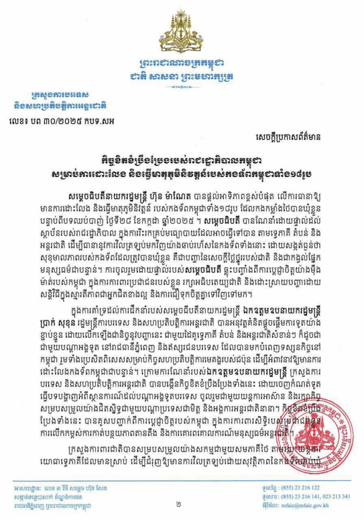រាជរដ្ឋាភិបាលកម្ពុជា​ ដឹកនាំដោយសម្ដេចធិបតី ហ៊ុន ម៉ាណែត បានផ្ដល់អាទិភាពខ្ពស់បំផុត លើការធានាឱ្យមានការដោះលែង និងធ្វើមាតុភូមិនិវត្តន៍ របស់កងទ័ពកម្ពុជាទាំង១៨រូប ដែលកងកម្លាំងថៃបានឃុំខ្លួន បន្ទាប់ពីបទឈប់បាញ់ ថ្ងៃទី២៨ ខែកក្កដា ឆ្នាំ២០២៥ ។