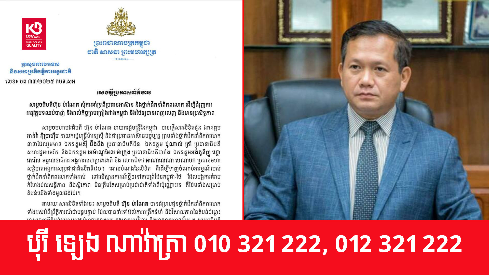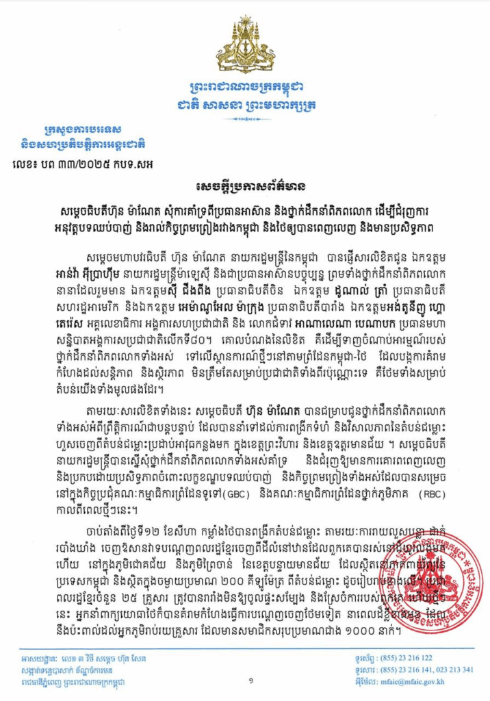 សម្ដេចធិបតី ហ៊ុន ម៉ាណែត នាយករដ្ឋមន្រ្ដីនៃកម្ពុជា បានផ្ញើលិខិតសុំការគាំទ្រពីប្រធានអាស៊ាន និងថ្នាក់ដឹកនាំពិភពលោក ដើម្បីជំរុញការអនុវត្តបទឈប់បាញ់ និងរាល់កិច្ចព្រមព្រៀងរវាងកម្ពុជា និងថៃឲ្យបានពេញលេញ និងមានប្រសិទ្ធភាព។