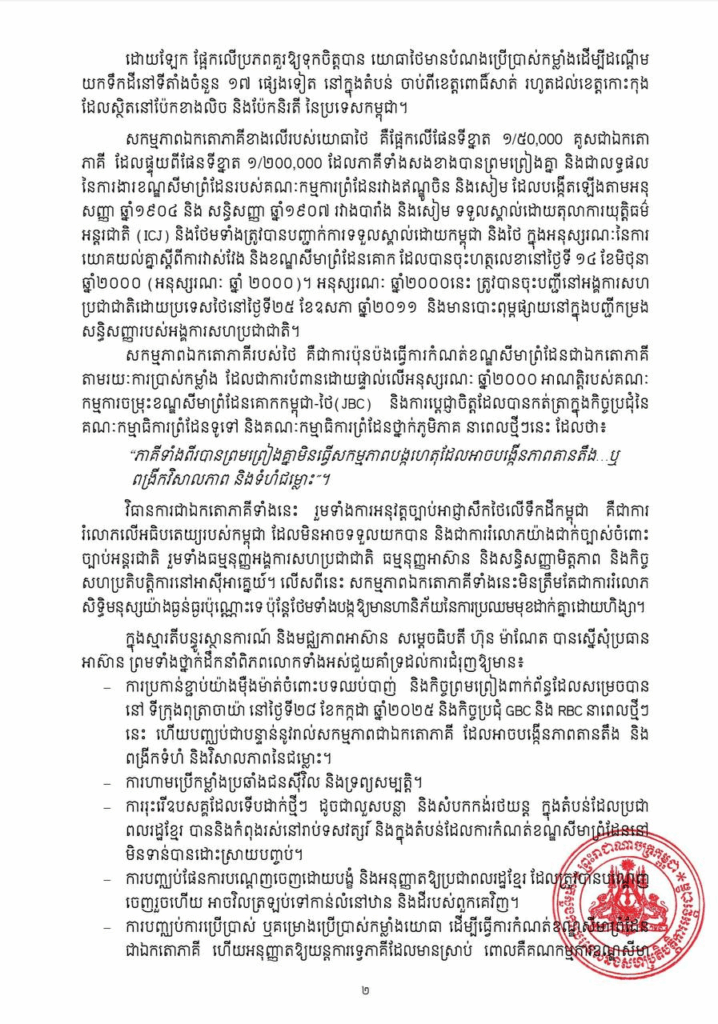សម្តេចធិបតីនាយករដ្ឋមន្ត្រីបានស្នើសុំថ្នាក់ដឹកនាំពិភពលោកទាំងអស់គាំទ្រ និងជំរុញឱ្យមានការគោរពពេញលេញ និងប្រកបដោយប្រសិទ្ធភាពចំពោះលក្ខខណ្ឌបទឈប់បាញ់ និងកិច្ចព្រមព្រៀងទាំងអស់ដែលបានសម្រេចនៅក្នុងកិច្ចប្រជុំគណៈកម្មាធិការព្រំដែនទូទៅ(GBC) និងគណៈកម្មាធិការព្រំដែនថ្នាក់ភូមិភាគ (RBC)កាលពីពេលថ្មីៗនេះ។